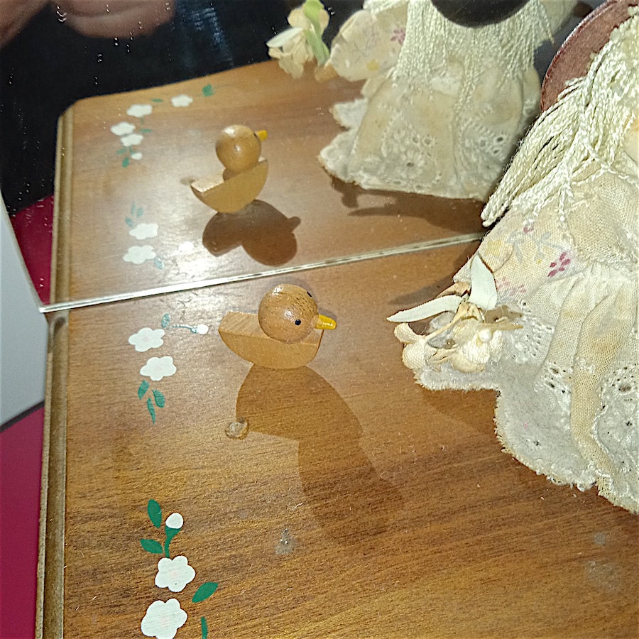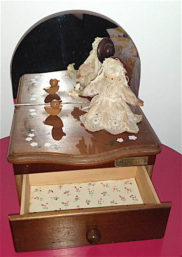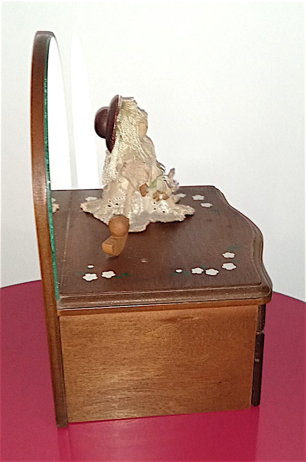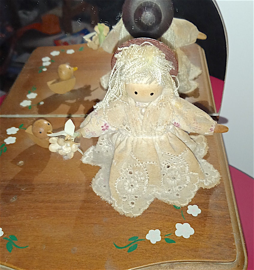 beautiful wooden music box with mirror and spinning doll