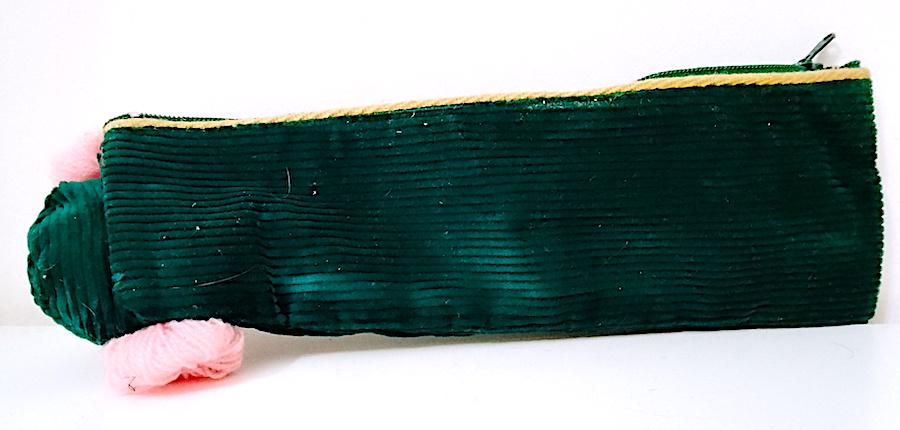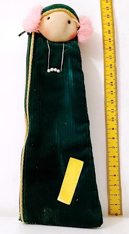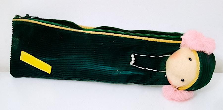 80s corduroy and fabric school pencil case with doll head