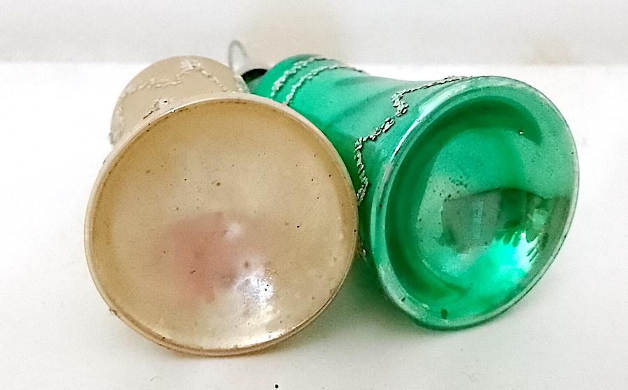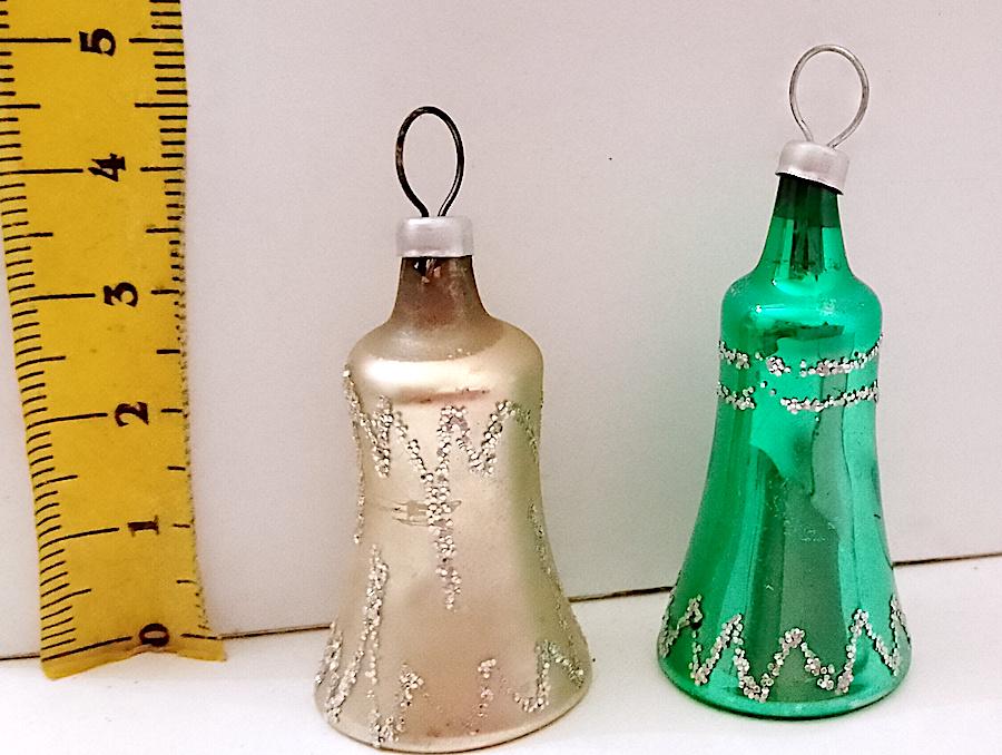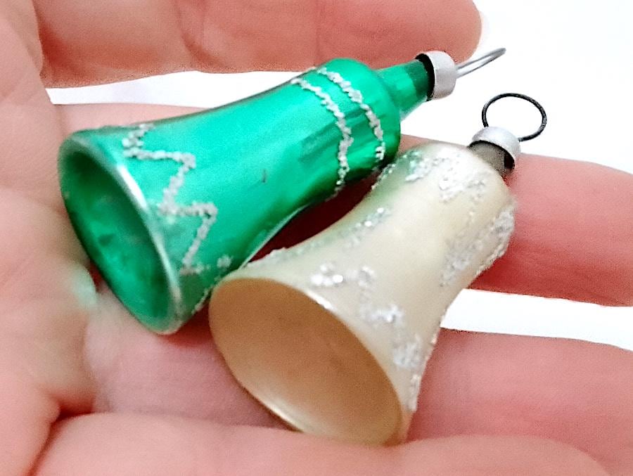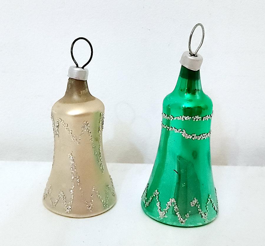 pair of small Christmas balls in the shape of bells - in glass with shiny decorations - excellent - as per photo - as is