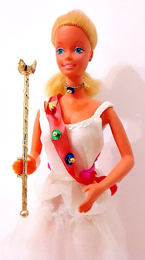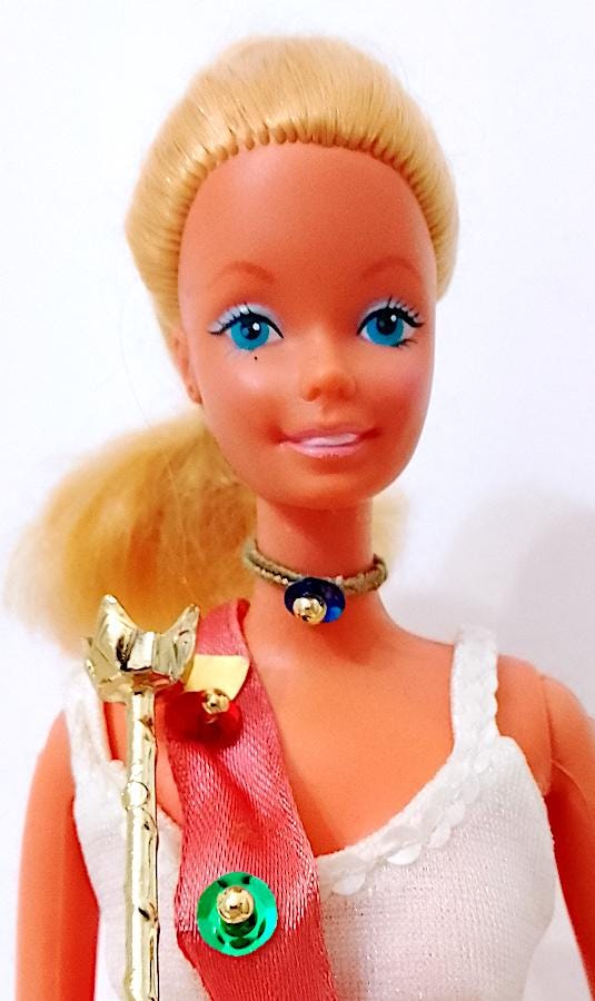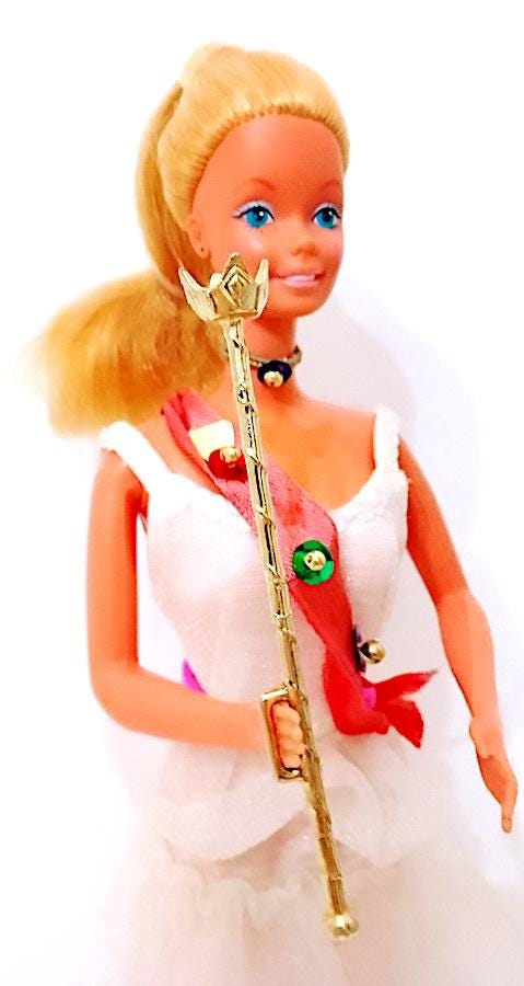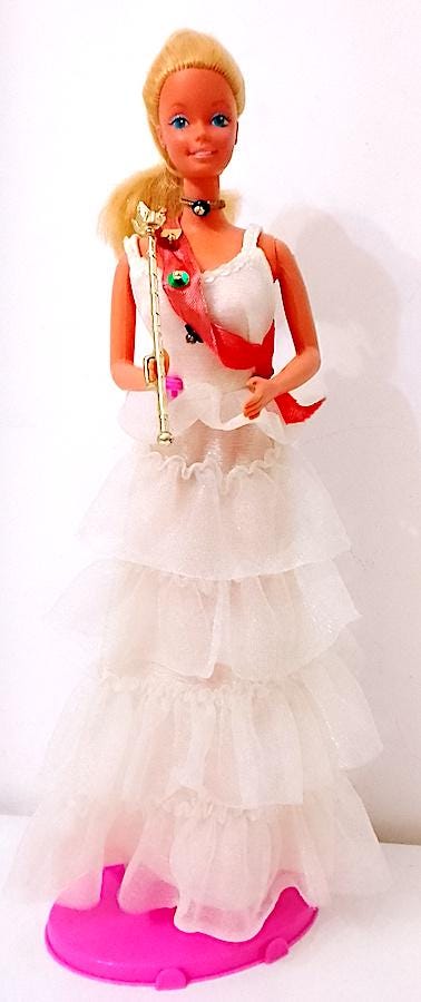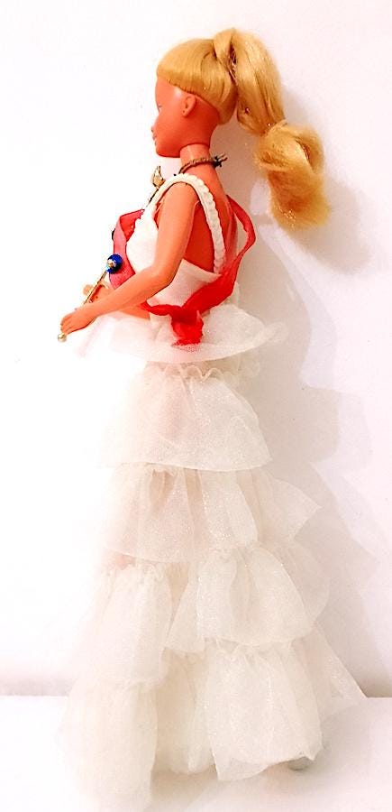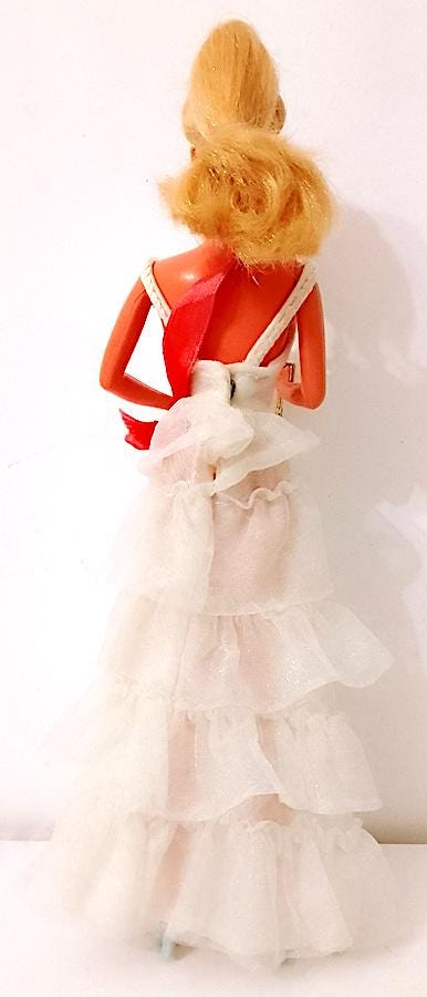Gorgeous Barbie Princess European version from 1980 Mattel Philippines - hair washed and combed - doll in good condition, the legs are splendid but do not click, the neck has undergone a repair and is perfectly firm, the repair is not very evident, the photos make it seem much more visible - the jewels and the crown are missing - the necklace collar has been redone because there was only the sequin and the pearl - the shoes were found together with the dress but are slightly gray even if in the photo they appear blue - the dress has been washed and the ribbon sewn better and still contains the original decorations but only one has the original adhesive golden deco - conditions as per photo - as is