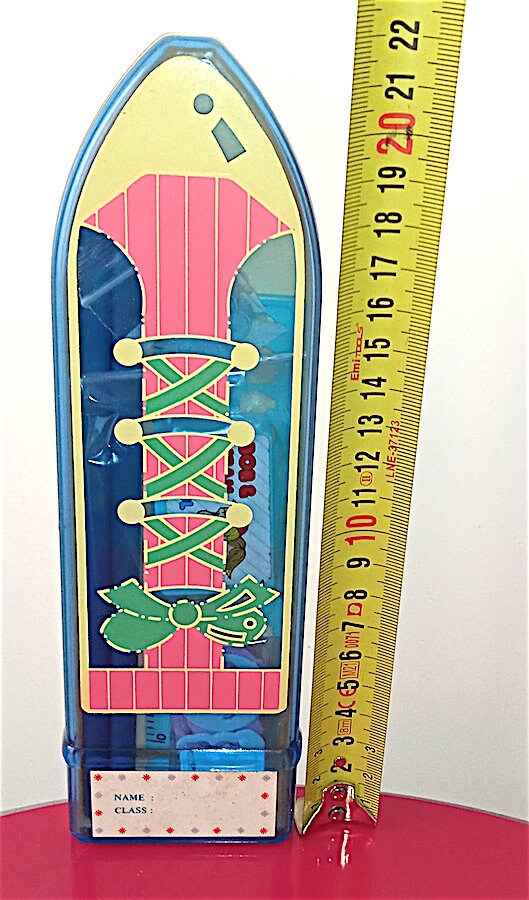 beautiful shoe-shaped plastic hard case containing 2 pencils, mini animal clips, eraser, sharpener and ruler