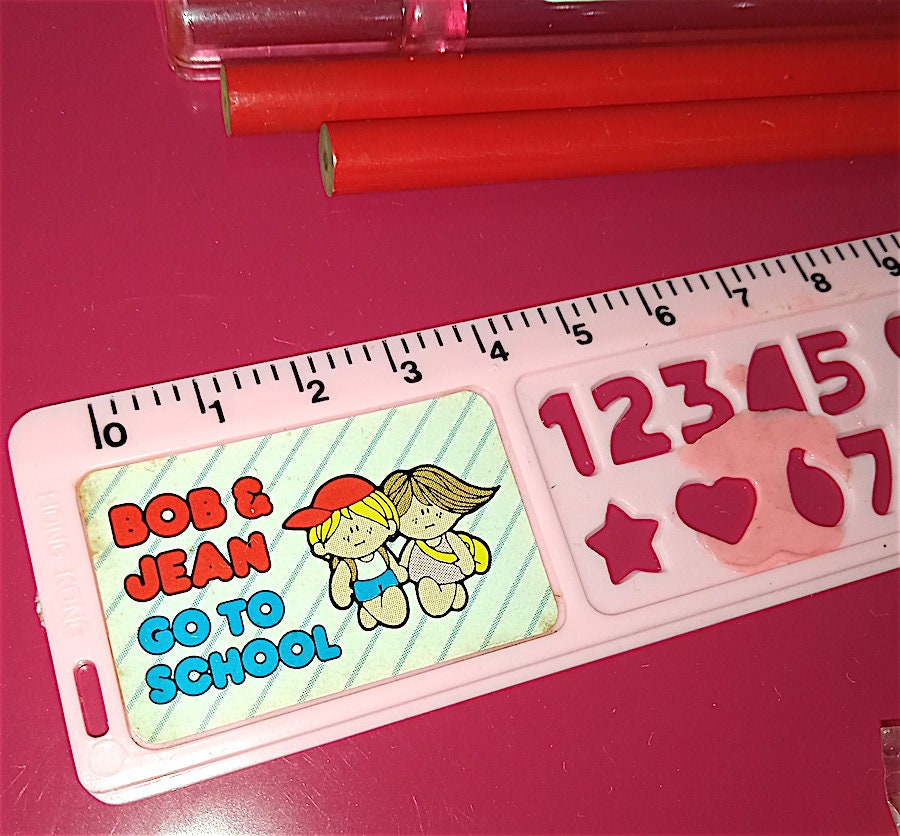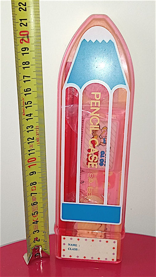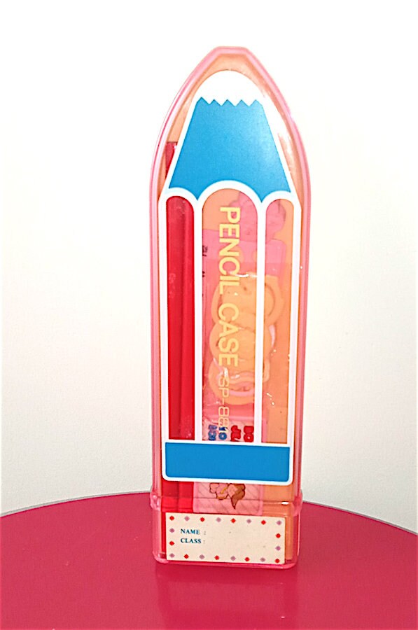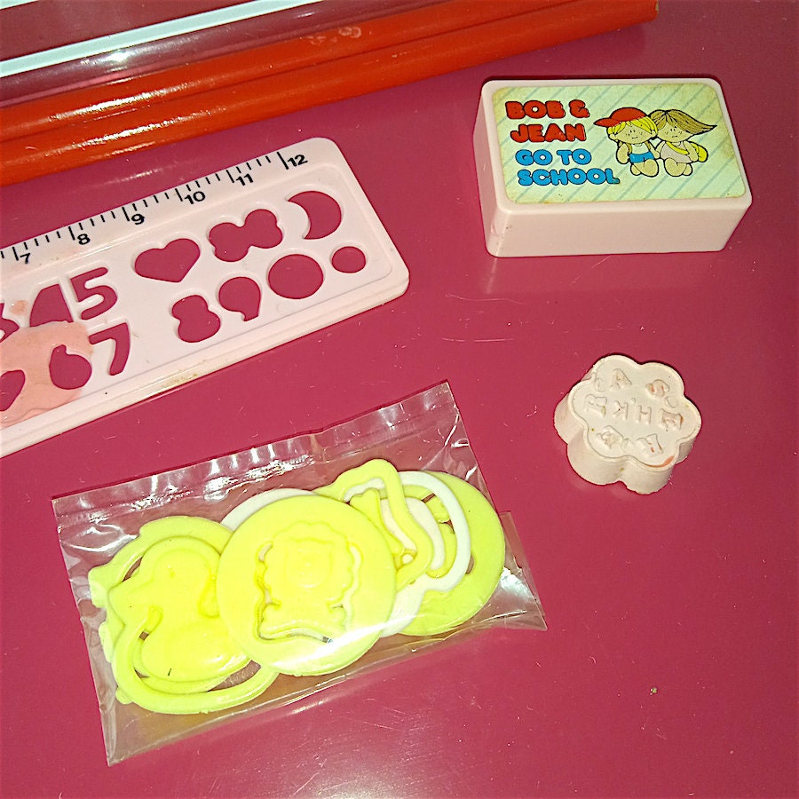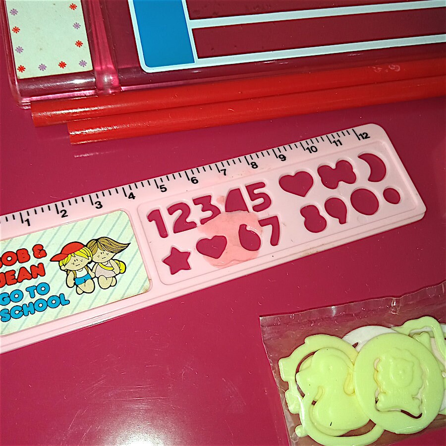 beautiful shoe-shaped plastic hard case containing 2 pencils, mini animal clips, eraser, sharpener and ruler