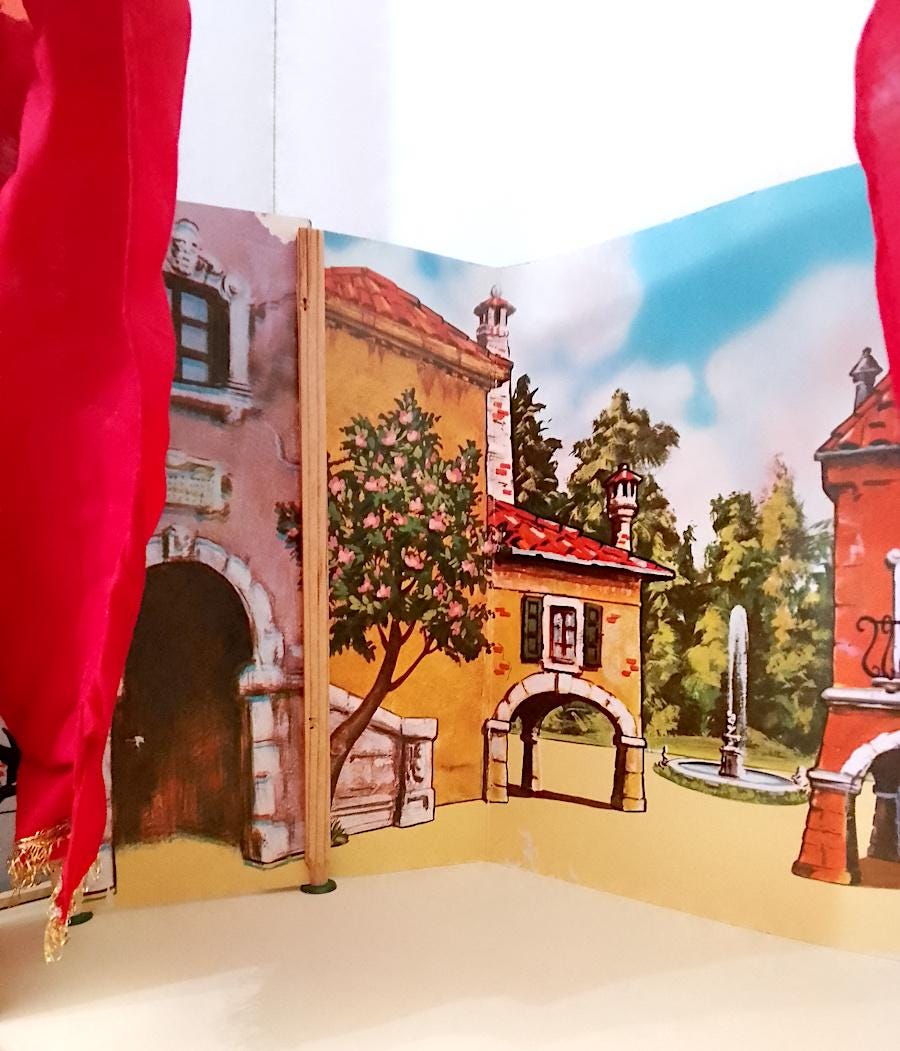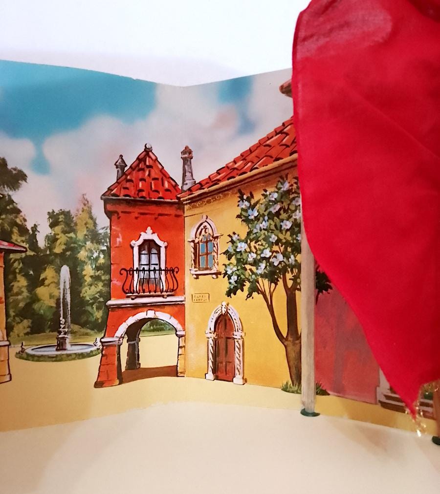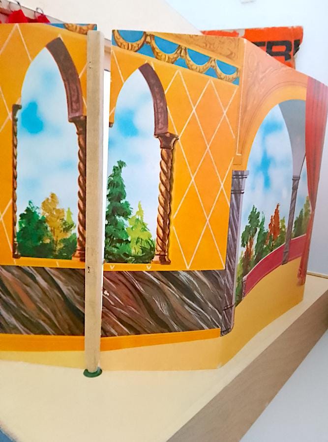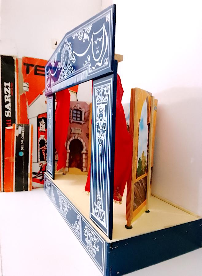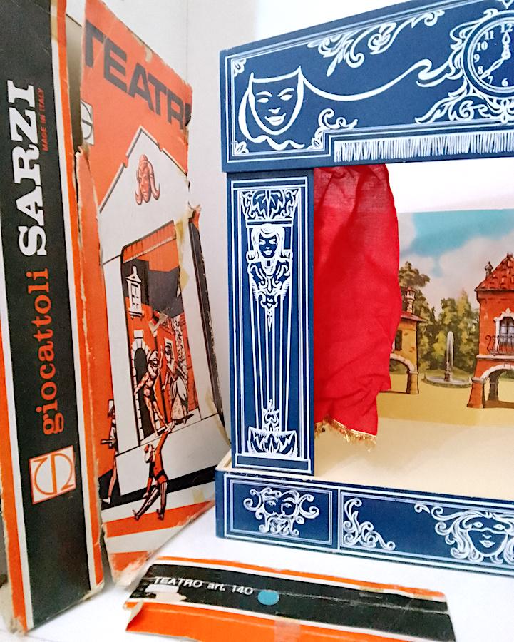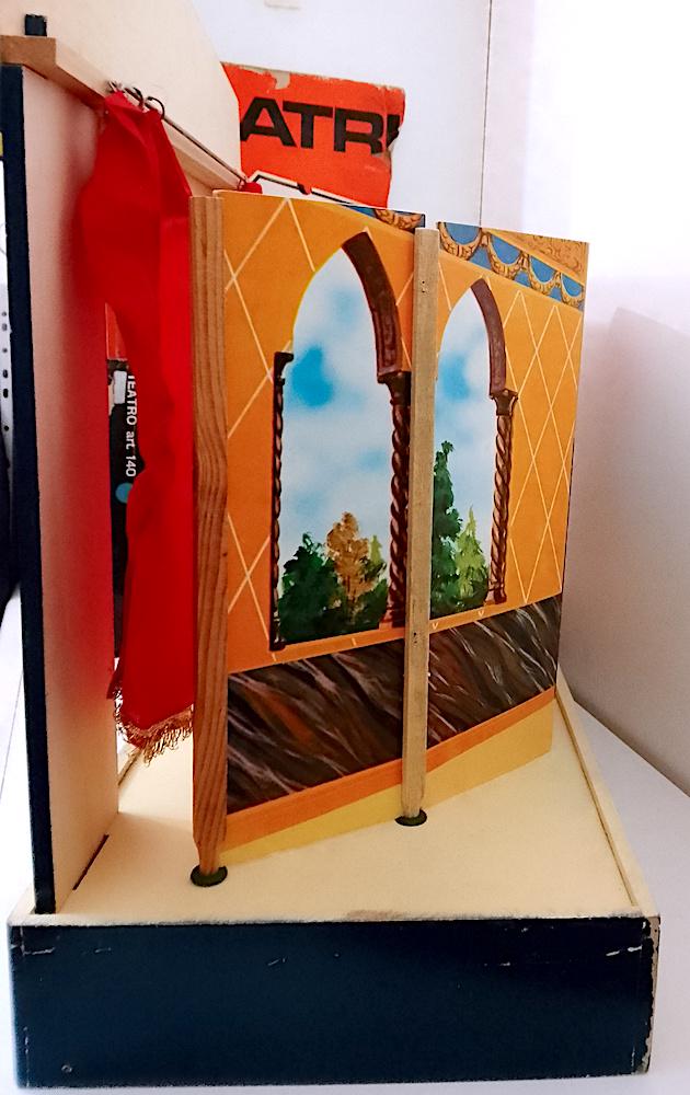 beautiful wooden puppet theater with cotton curtains and double front and back cardboard scenography - used but in excellent condition, all pieces present without breakages - measures 52 centimeters high x a base of 51 x 28 centimeters - dismantled everything remains closed inside the base which is a wooden box - also present part of the original cardboard box which however is very damaged, I send it well wrapped as in the final photo - as is