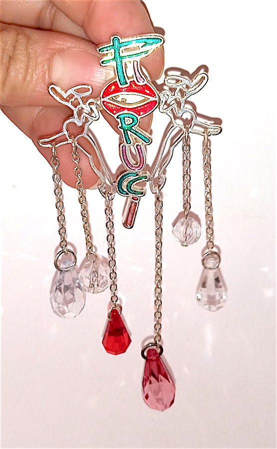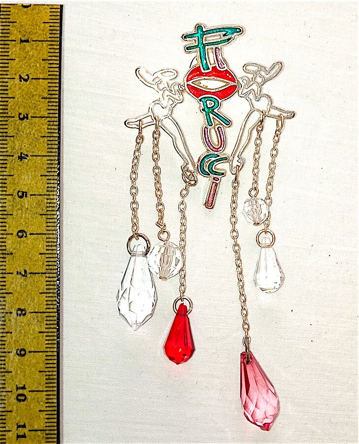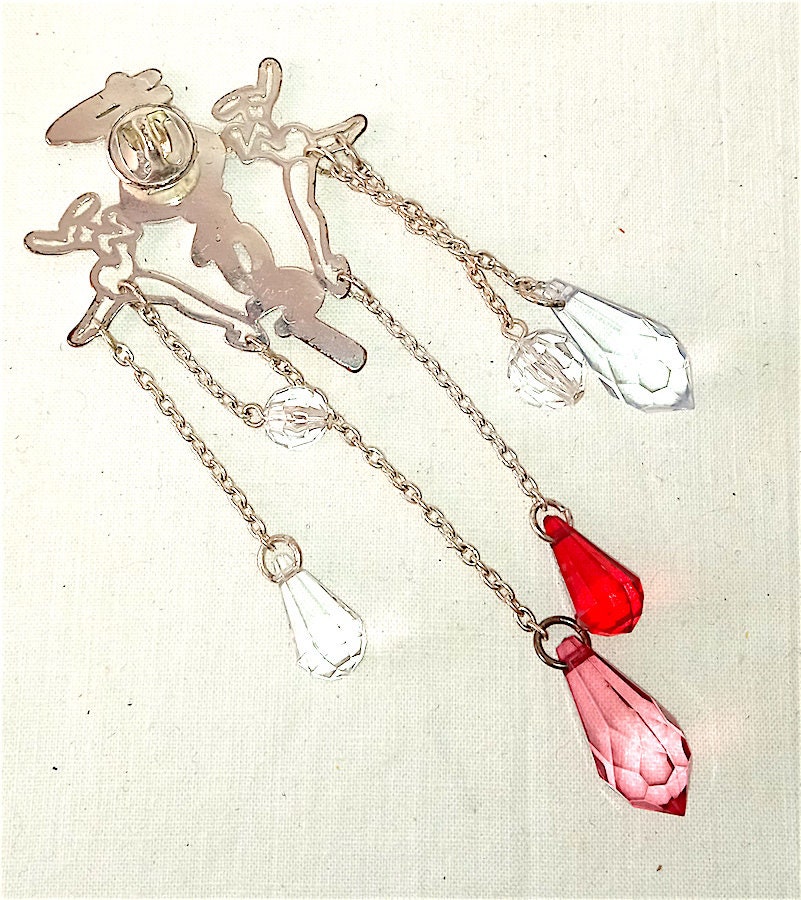 wonderful spectacular large brooch in silver metal with enamel and many decorative pendant charms with beads and two splendid Fiorucci bunnies