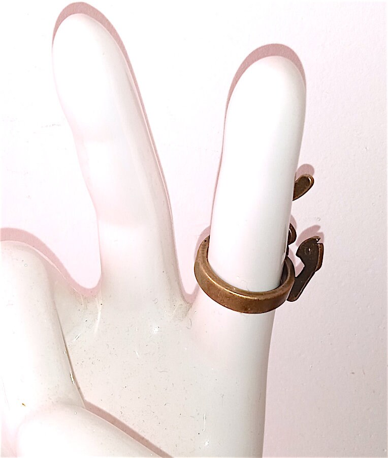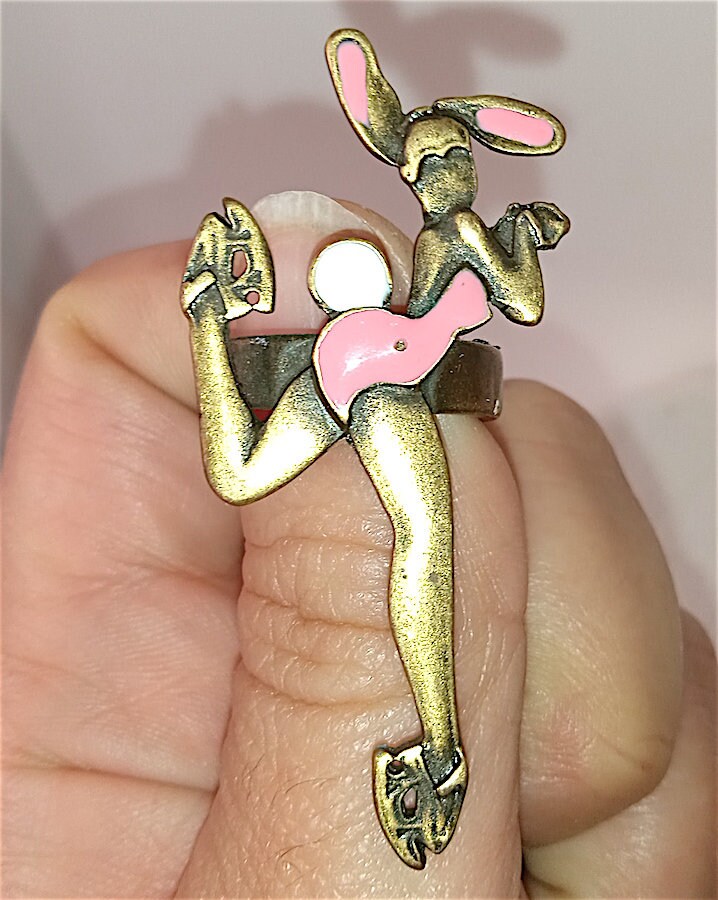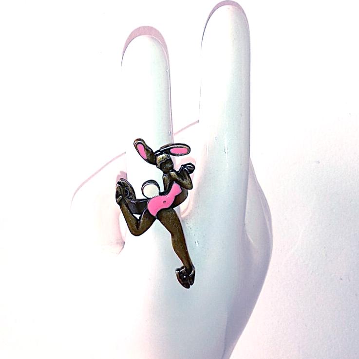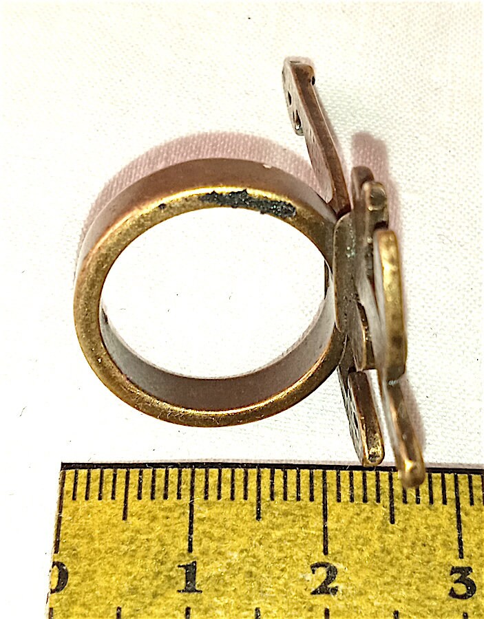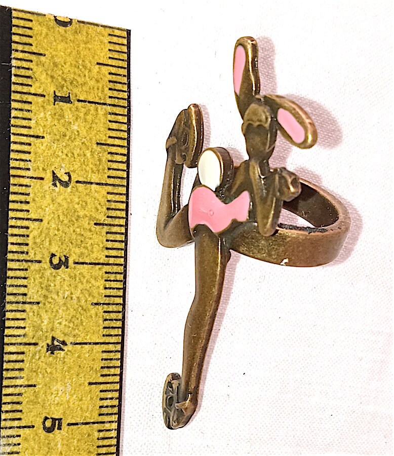 beautiful and rare maxi ring in antique bronze effect metal with pink and white enamel