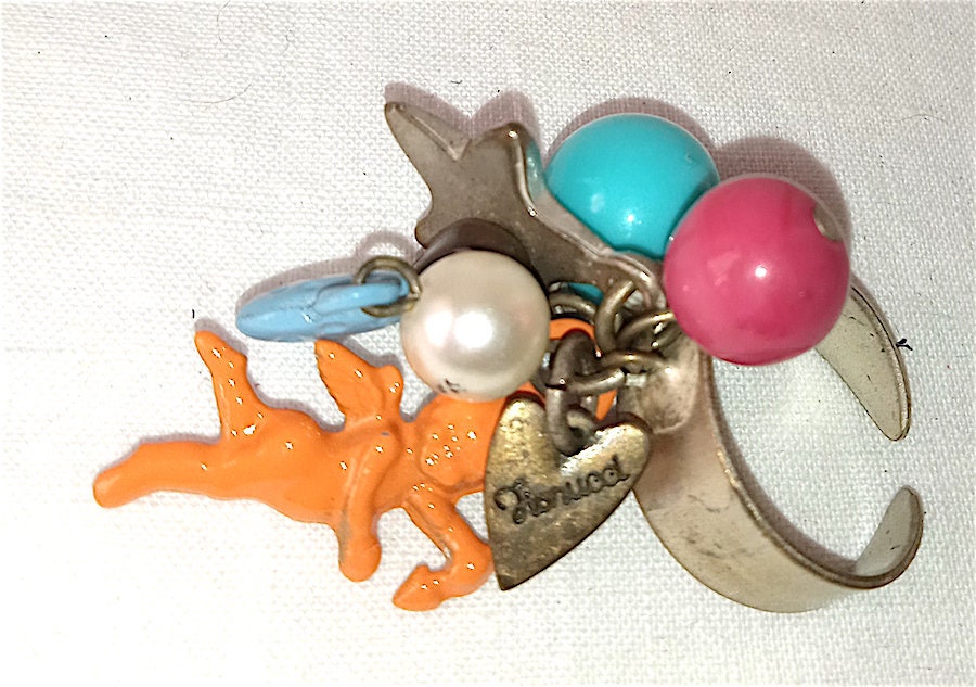 in silver metal with many coloured and shaped charms and a little heart with the Fiorucci logo