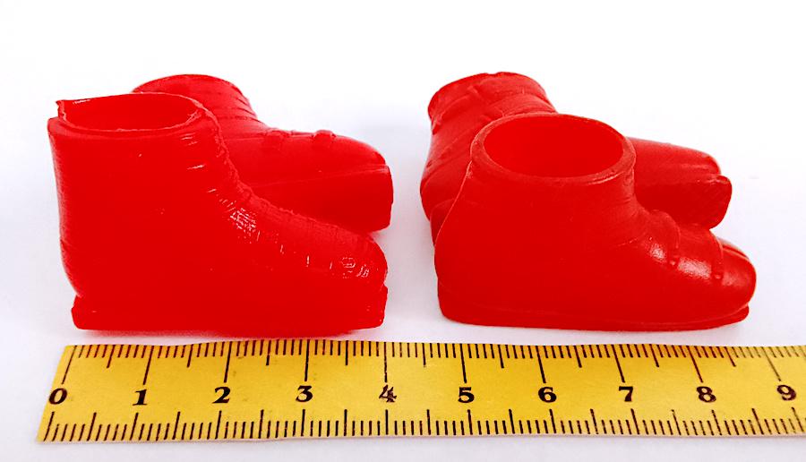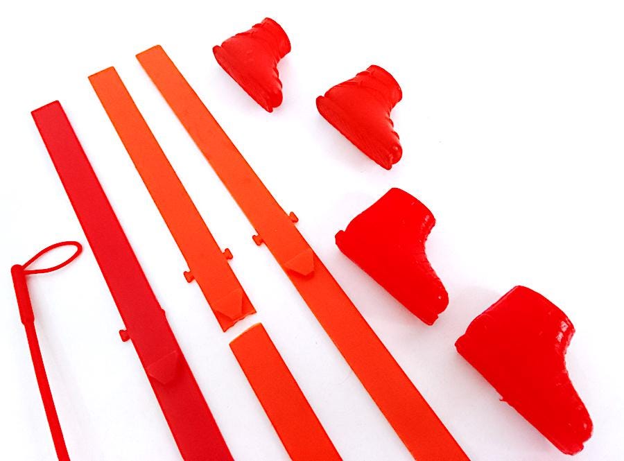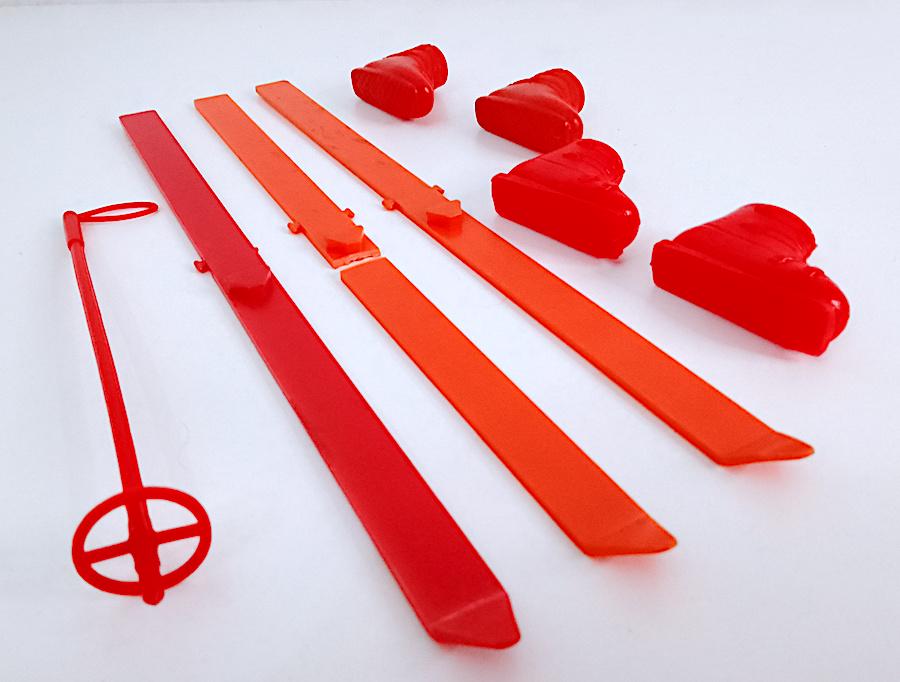 original set as per photo - orange skis, one broken to glue + 1 red ski + 1 red ski pole + rubber boots + red boots