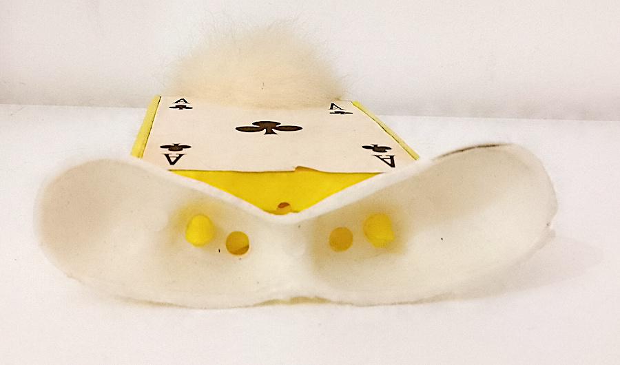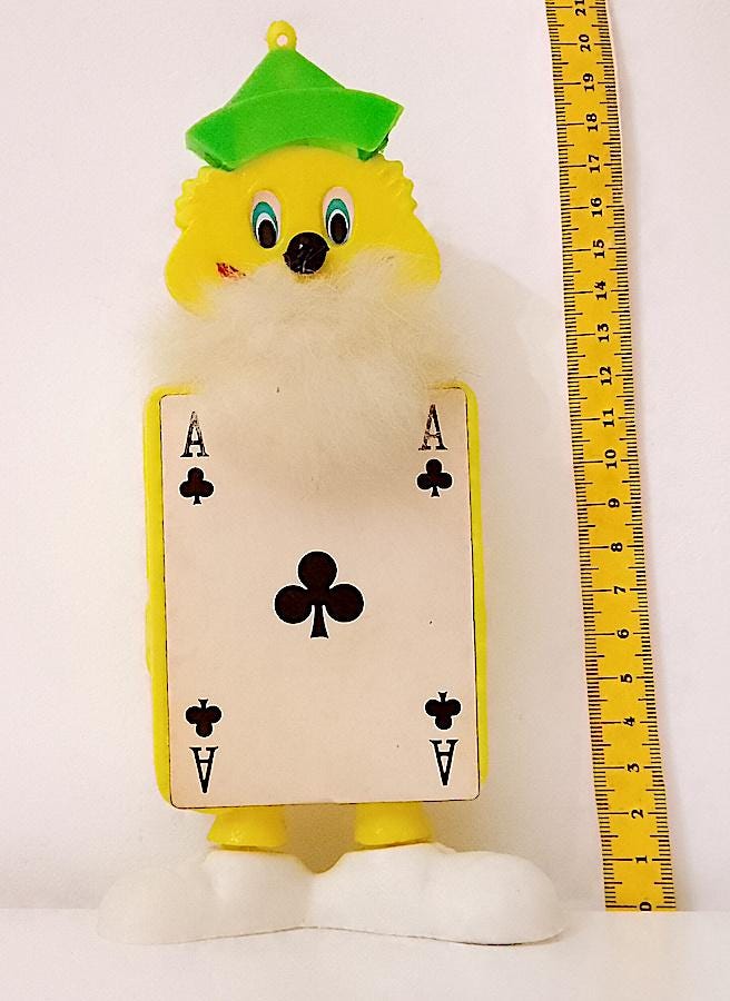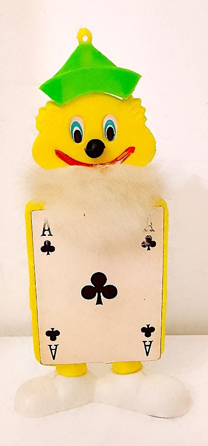 made of lightweight blown plastic with feathers and ace of clubs card figure