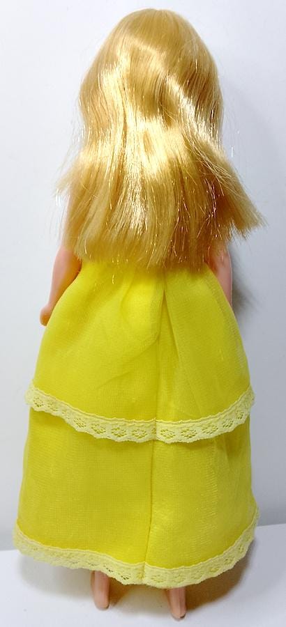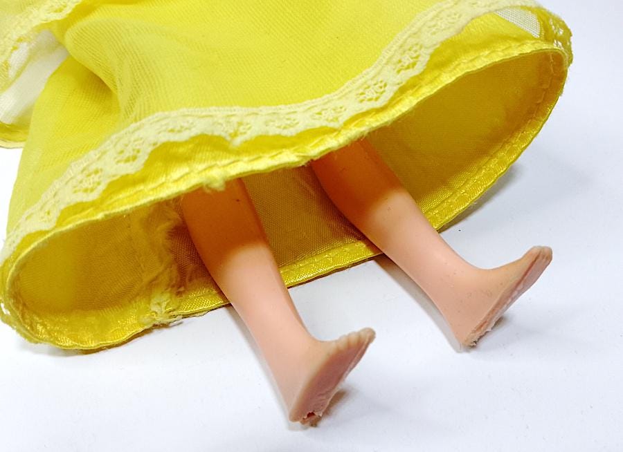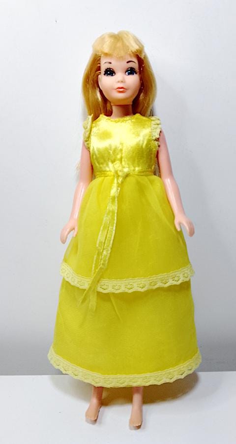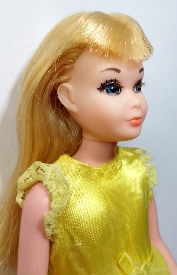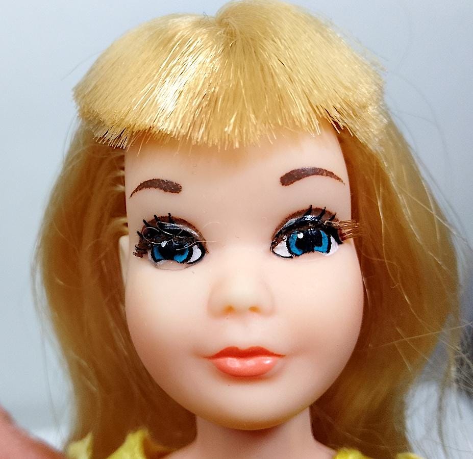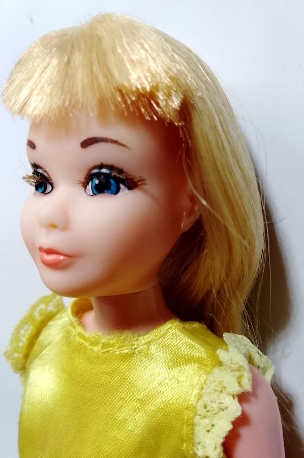 Original 1976 Skipper doll in excellent condition, hair washed and combed, perfect and shiny. Long nylon eyelashes (sorry for the fluff!) - excellent face - body in excellent condition and legs perfectly clicky - original dress in good condition, some signs of age on the ribbon but overall truly excellent - shoes missing - as shown in the photo - as is
