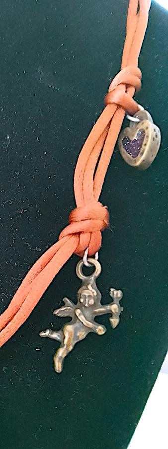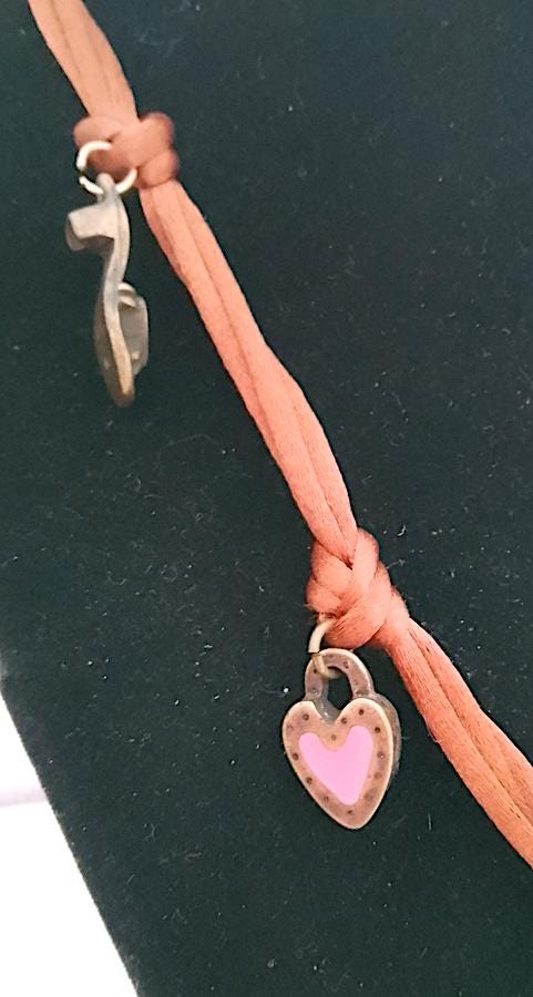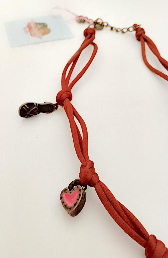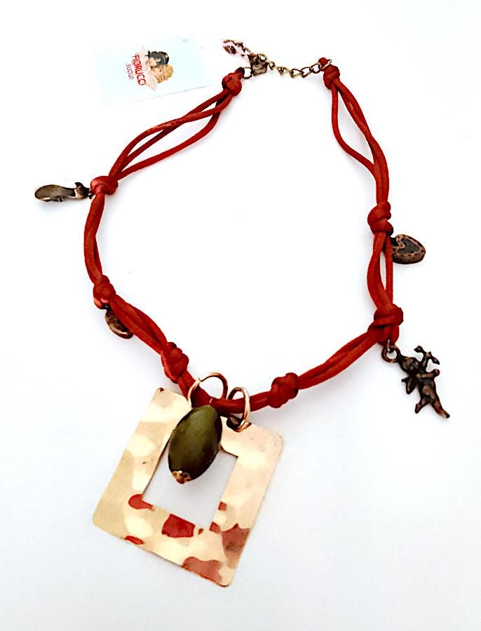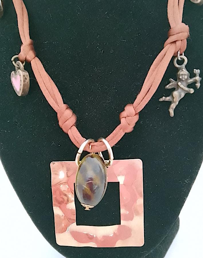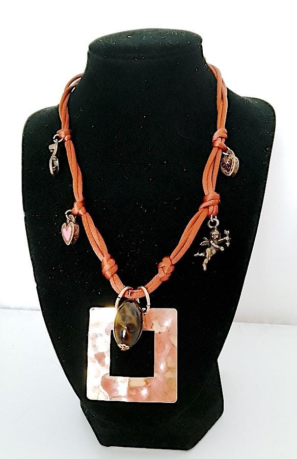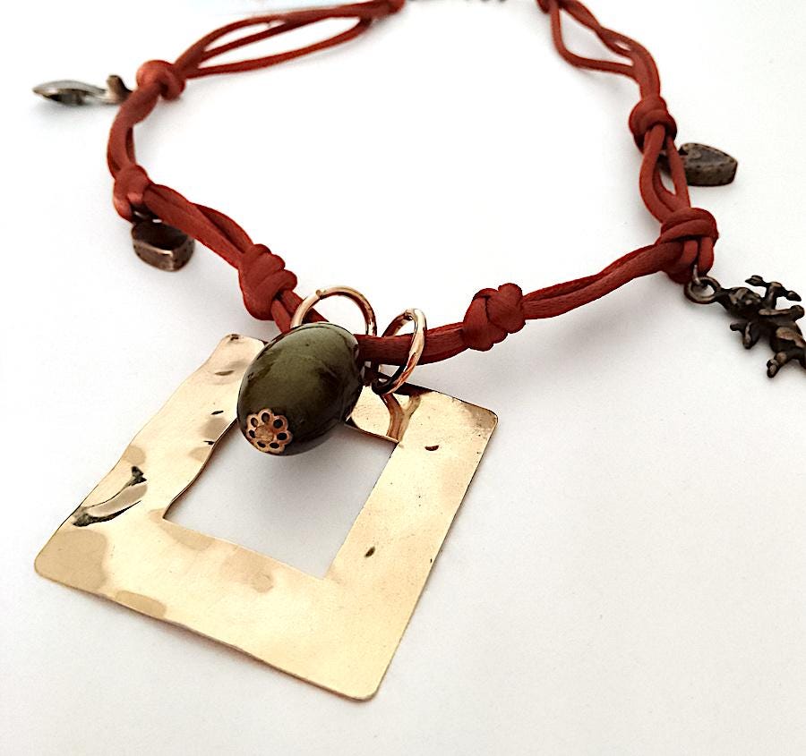 beautiful ethnic effect necklace with shiny brown ribbon woven with many metal and plastic charms - the main pendant is a wavy golden square with a plastic pearl in the center