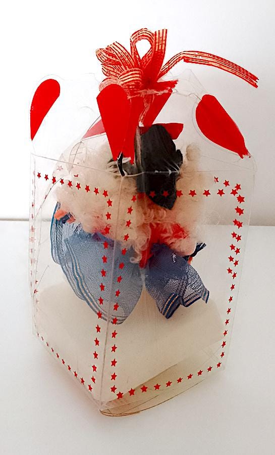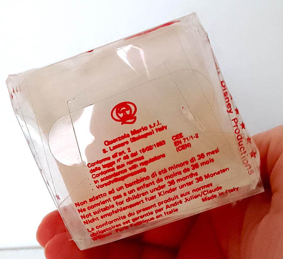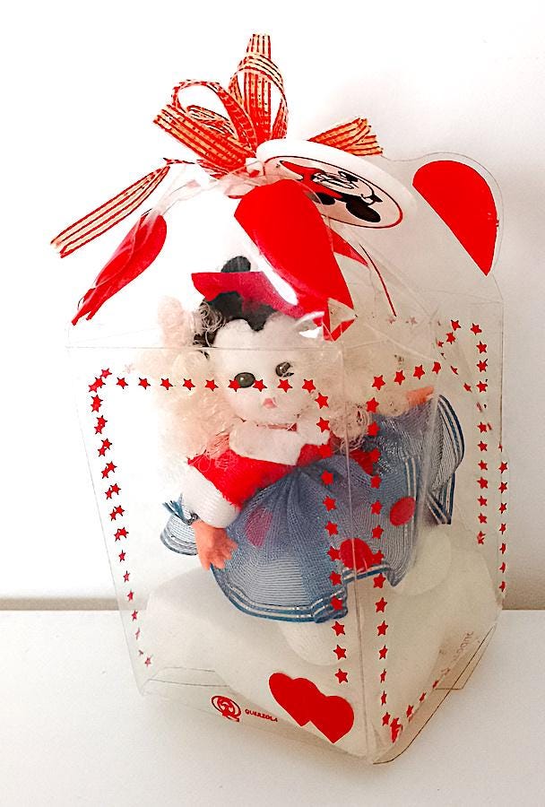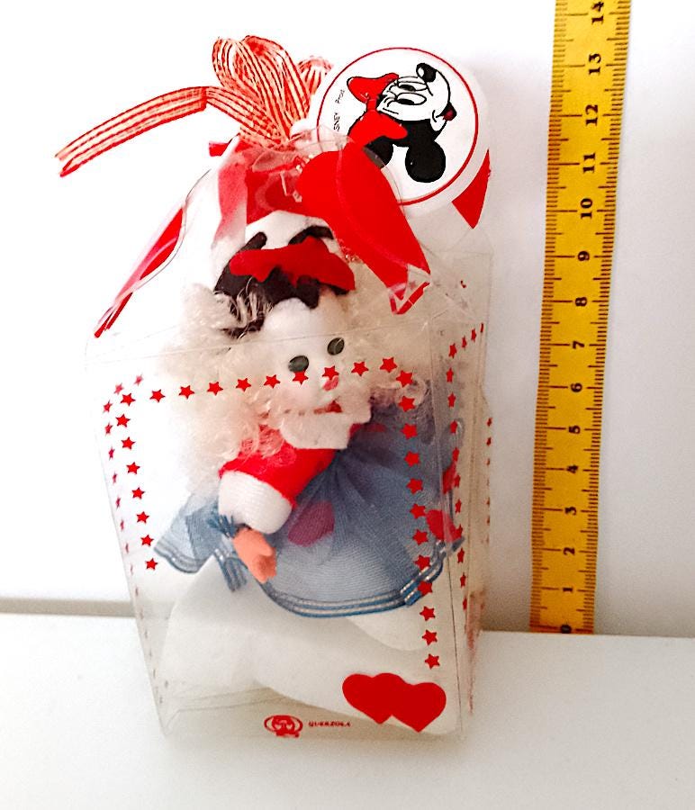 mini doll with clicking eyes, soft body, in gift box with Minnie tag from Querzola, 80s