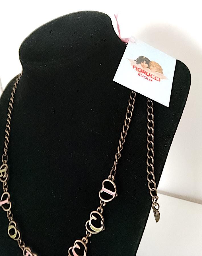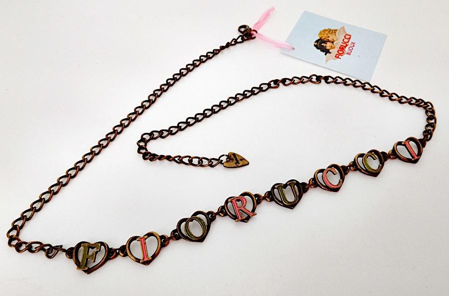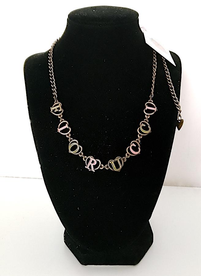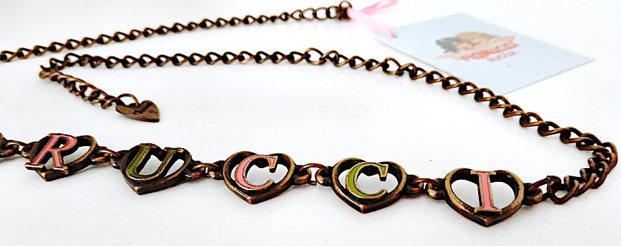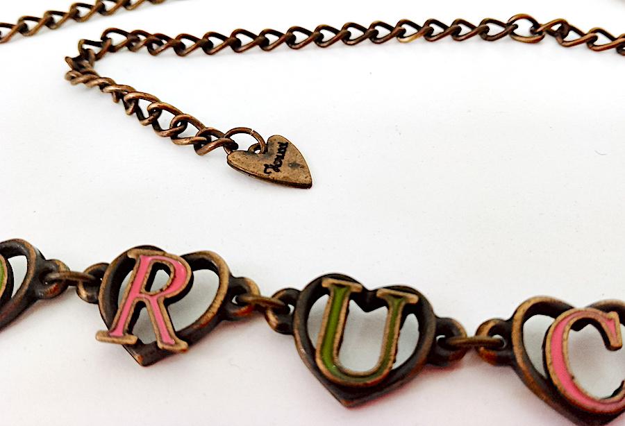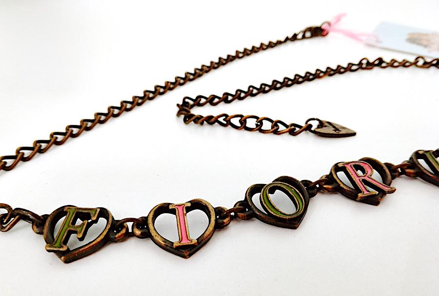 wonderful necklace in bronze-colored metal with an antique effect and lettering in hearts and enameled colors