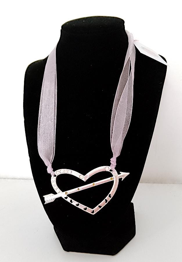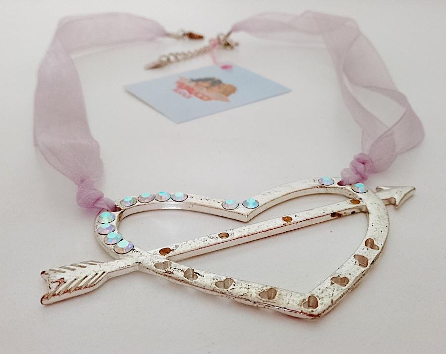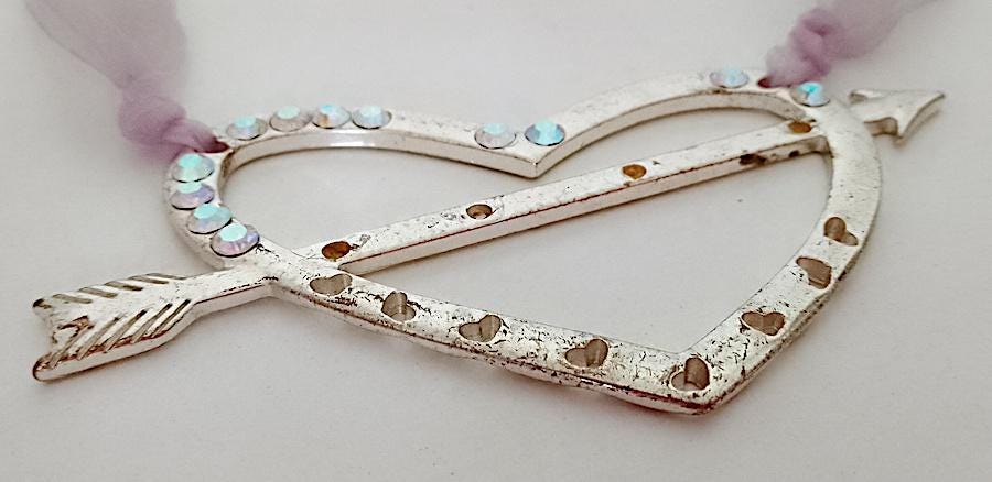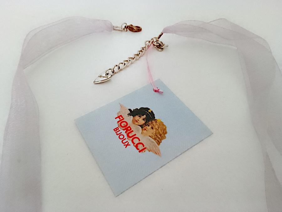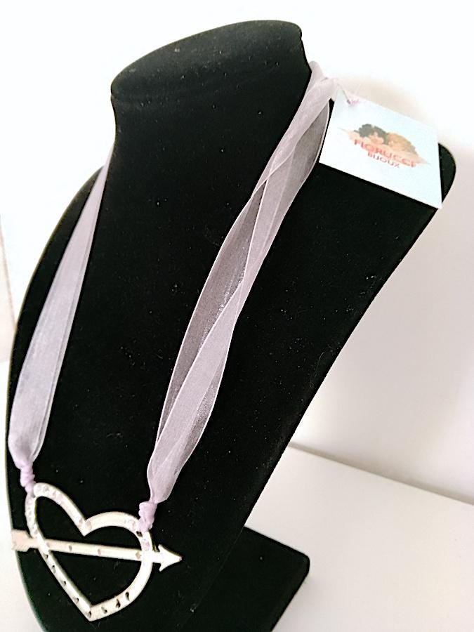 original necklace with large pendant in silver metal and iridescent glitter and iridescent ribbon in bright light purple lilac color