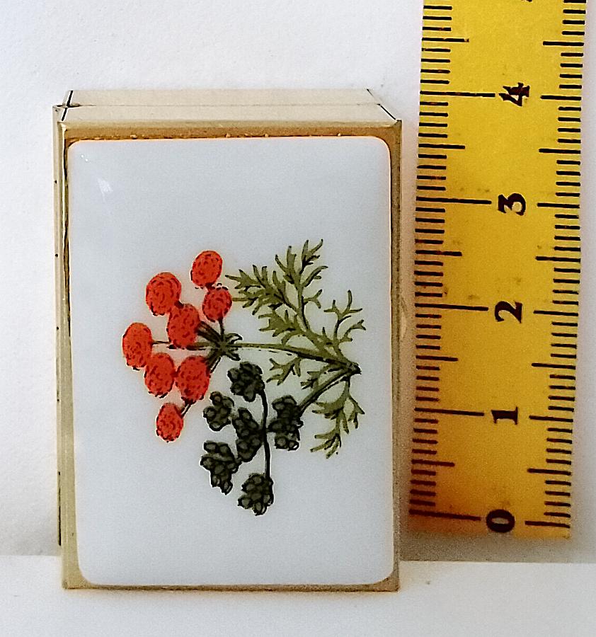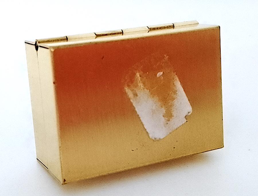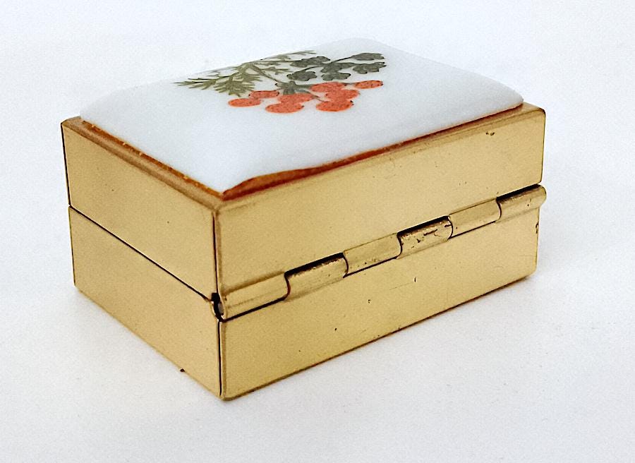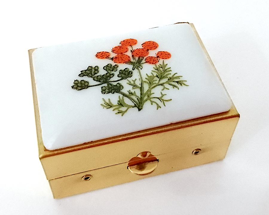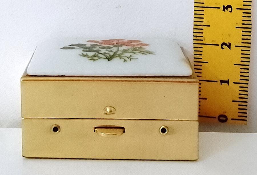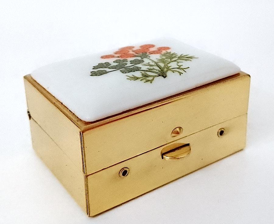 beautiful 70's pillbox in gold metal with ceramic lid with decorated flowers