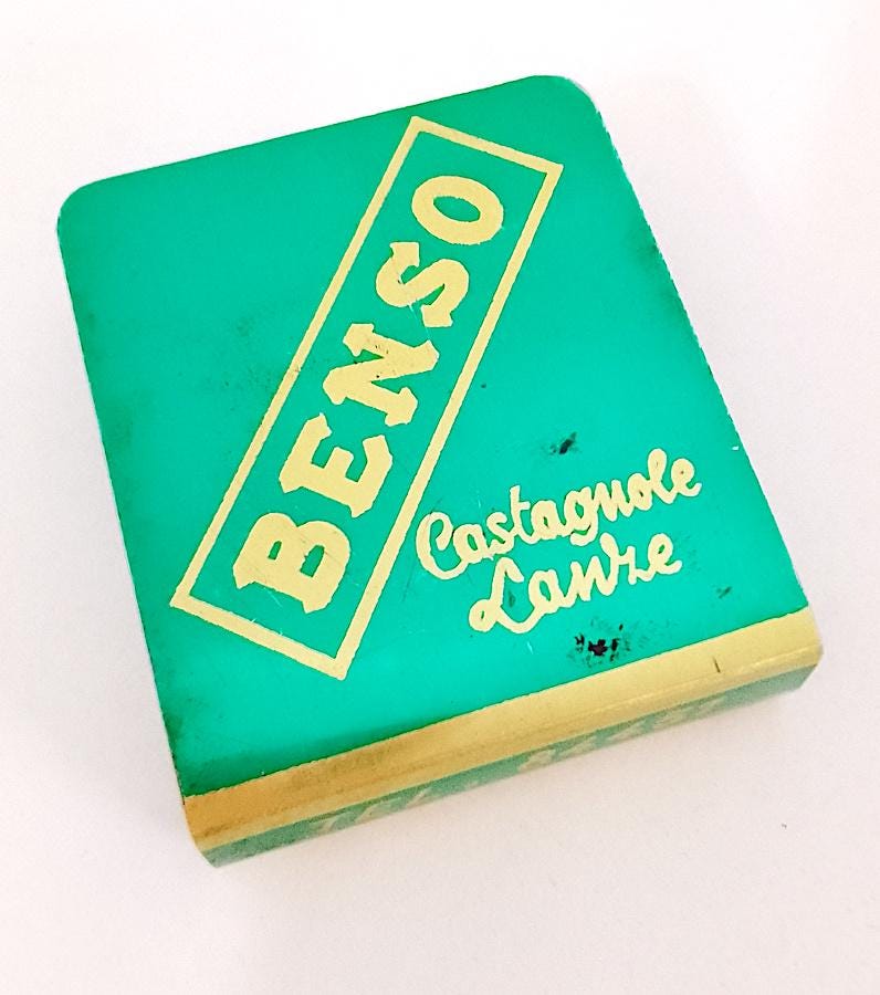 curious sign, napkin holder? Tin houses for matches? - silkscreened 1940s by the BENSO winery in Castagnole Lanze Asti - perfect condition as per photo - as is