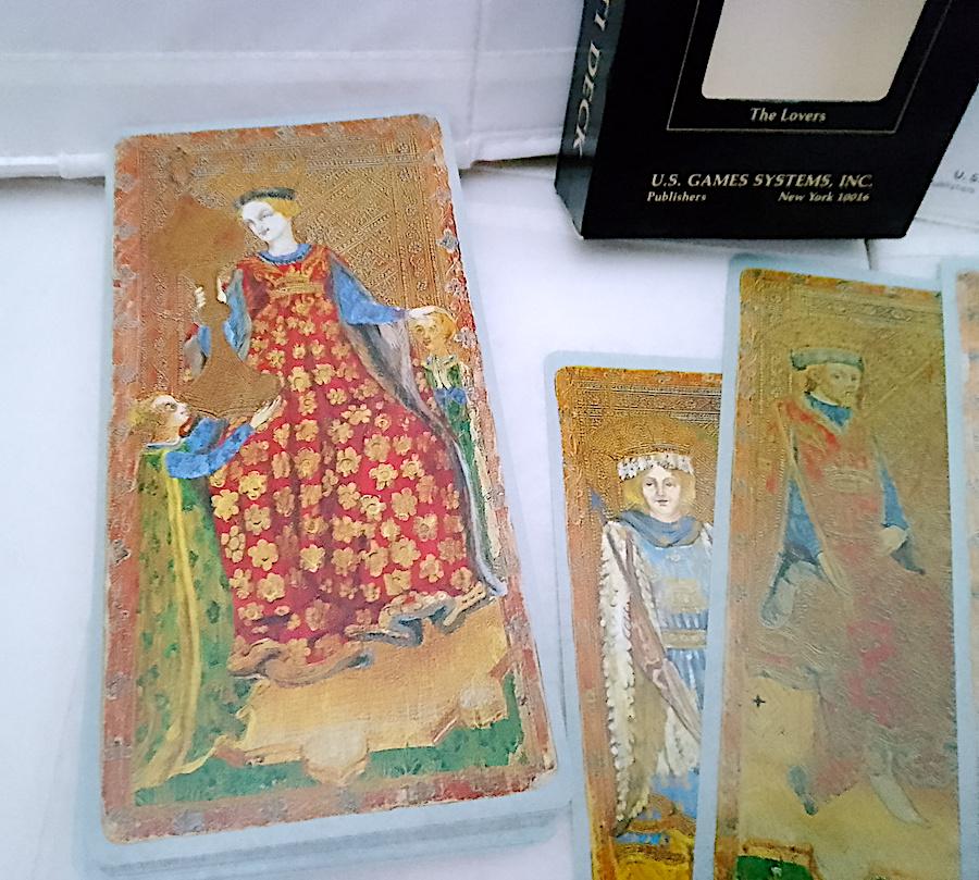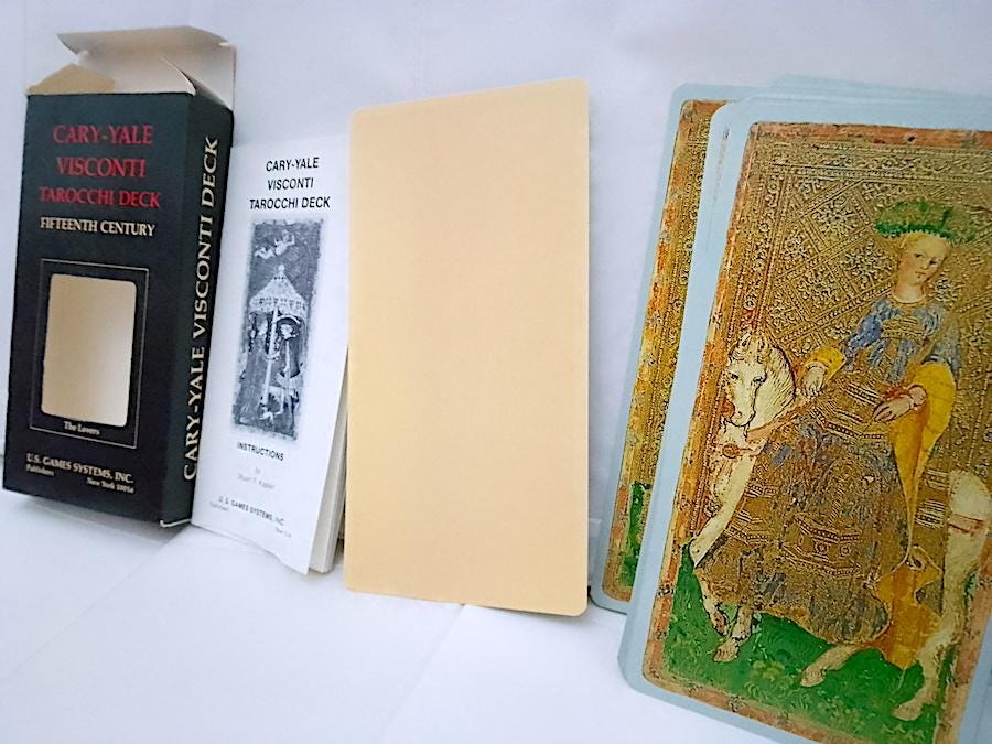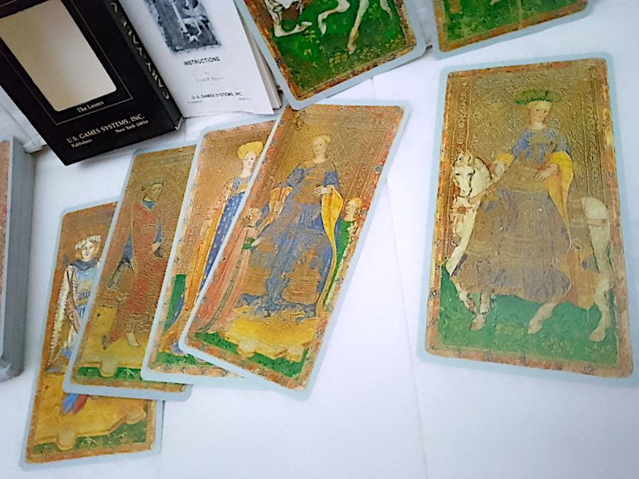 Like new, no marks on the cards - 86-card deck of large, laminated tarot cards in mint condition + instruction booklet in English + box - truly perfect!
