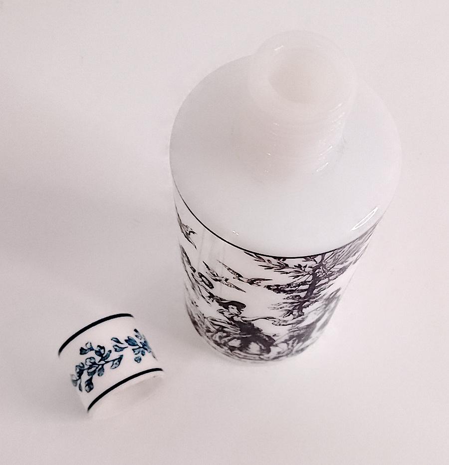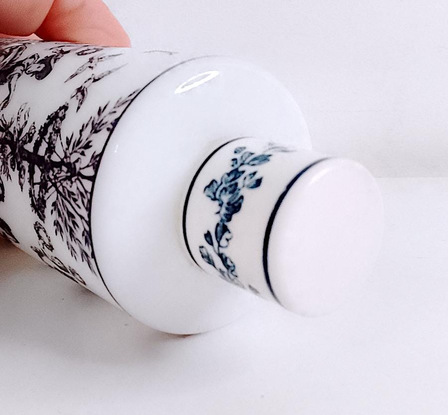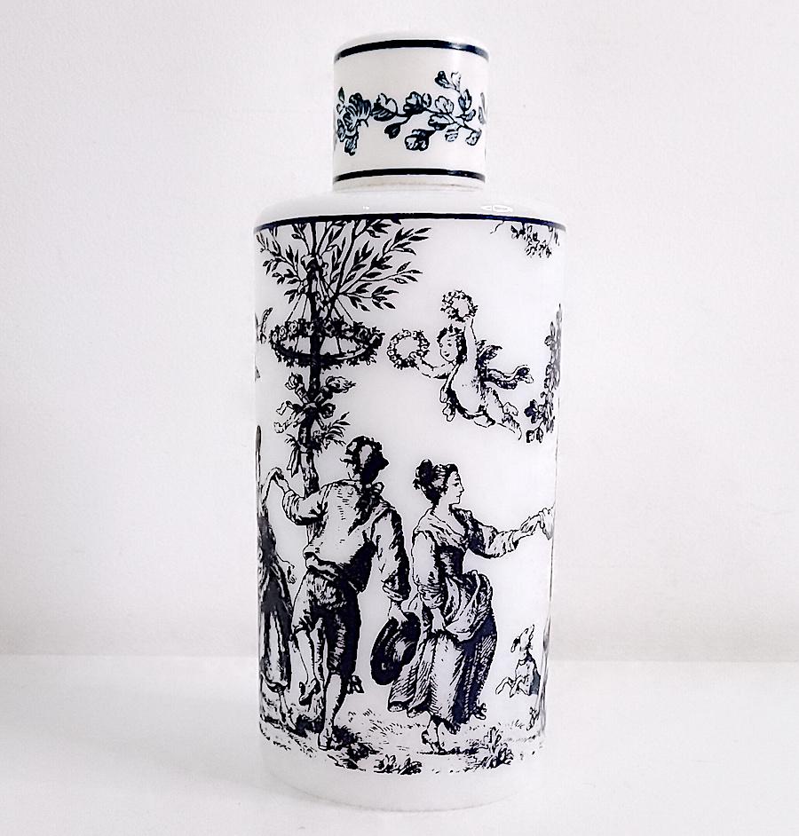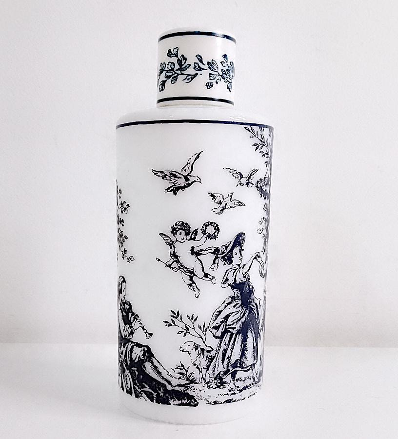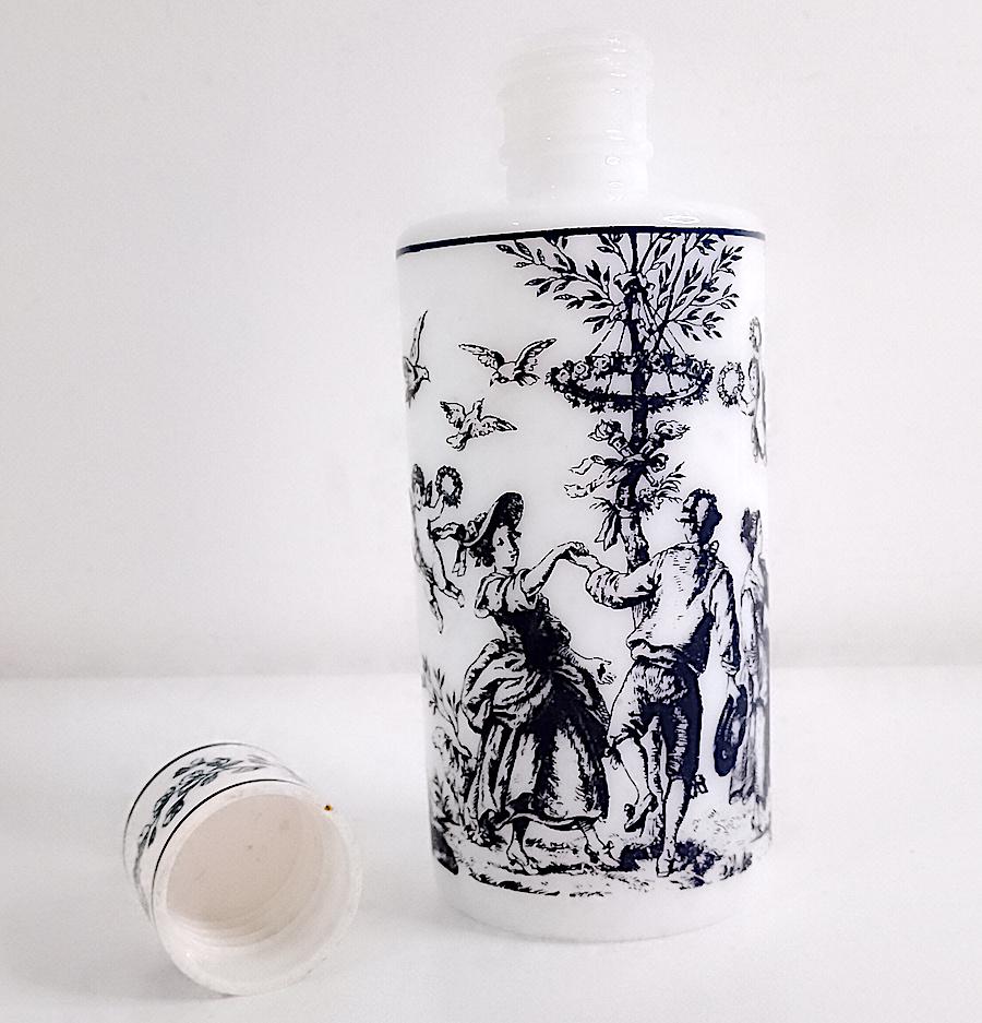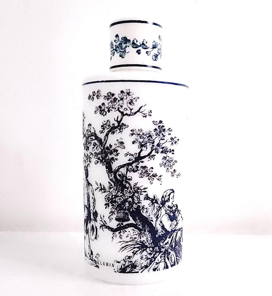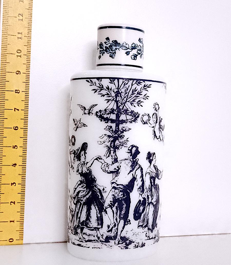 beautiful opaline glass bottle dark blue print - used but excellent, empty without perfume with original cap excellent condition