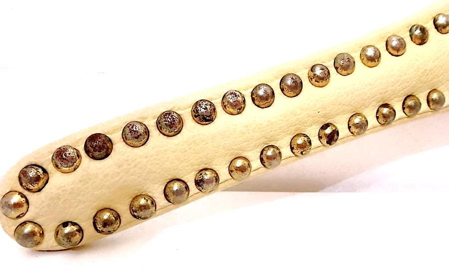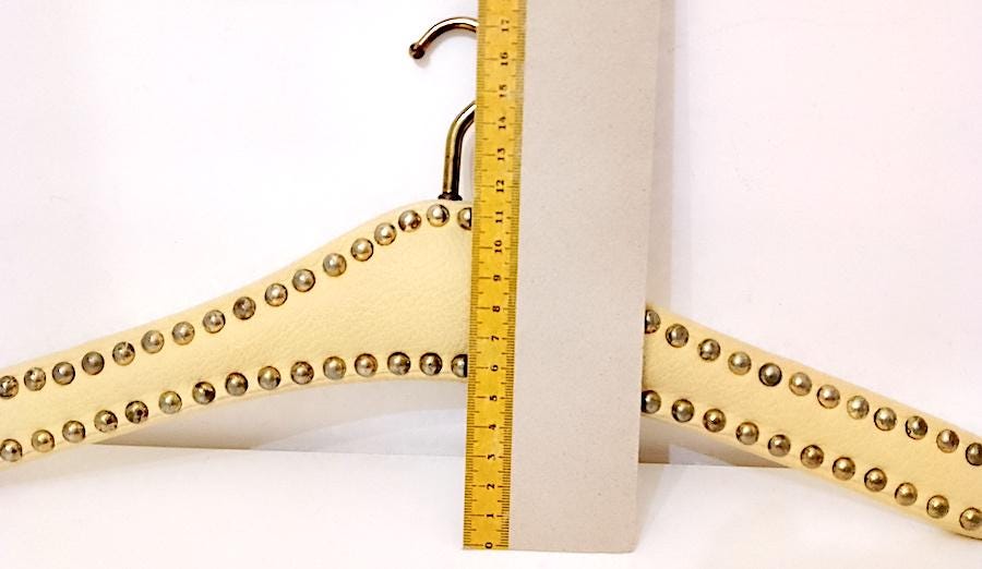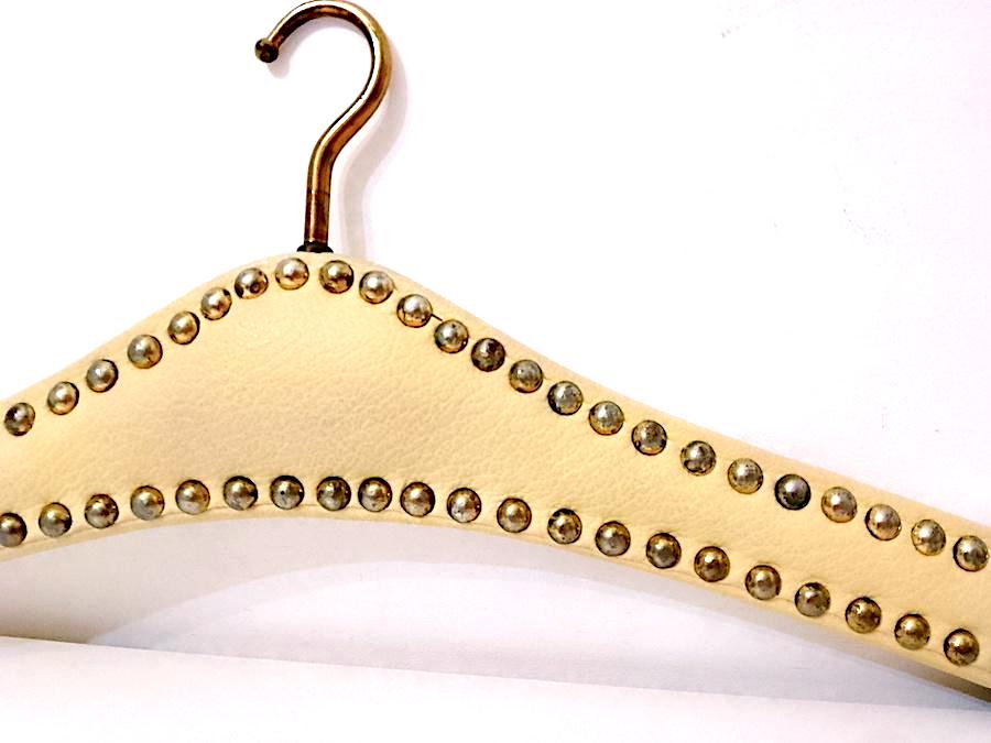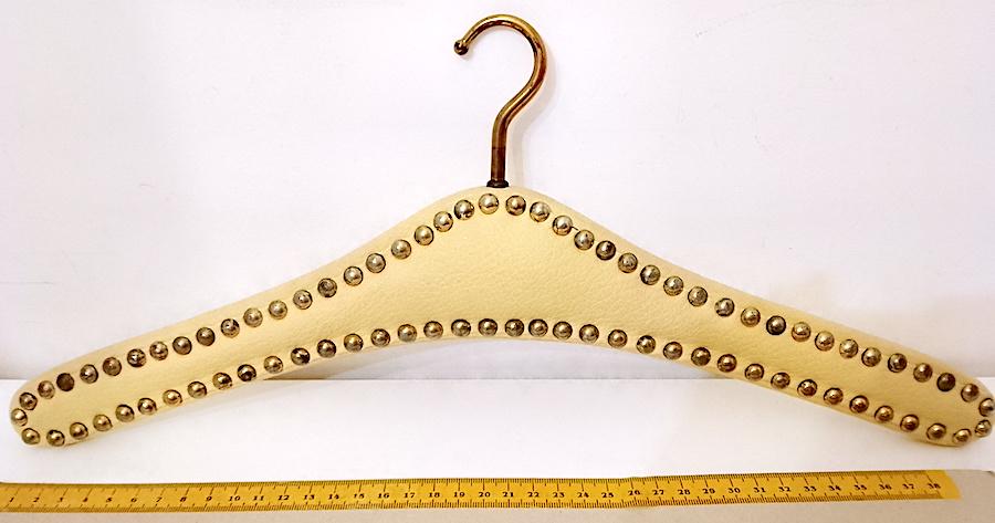 beautiful super glamorous 70s coat hanger in heavy wood covered in cream white leather and gold studs - used but in excellent condition, just need cleaning and polishing the studs better - measures approximately 42 centimetres wide - as per photo - as is