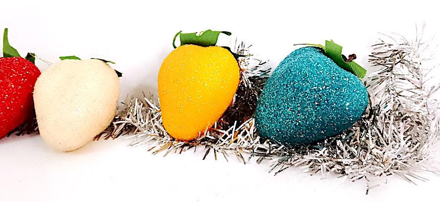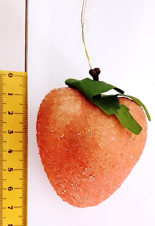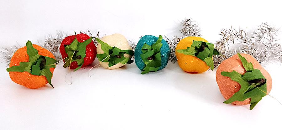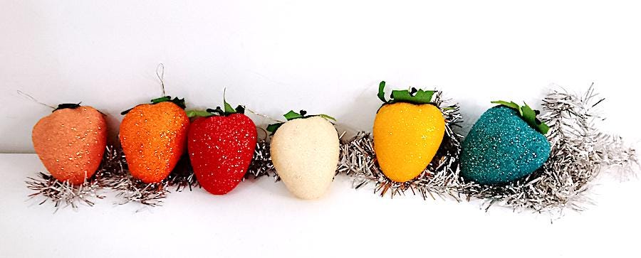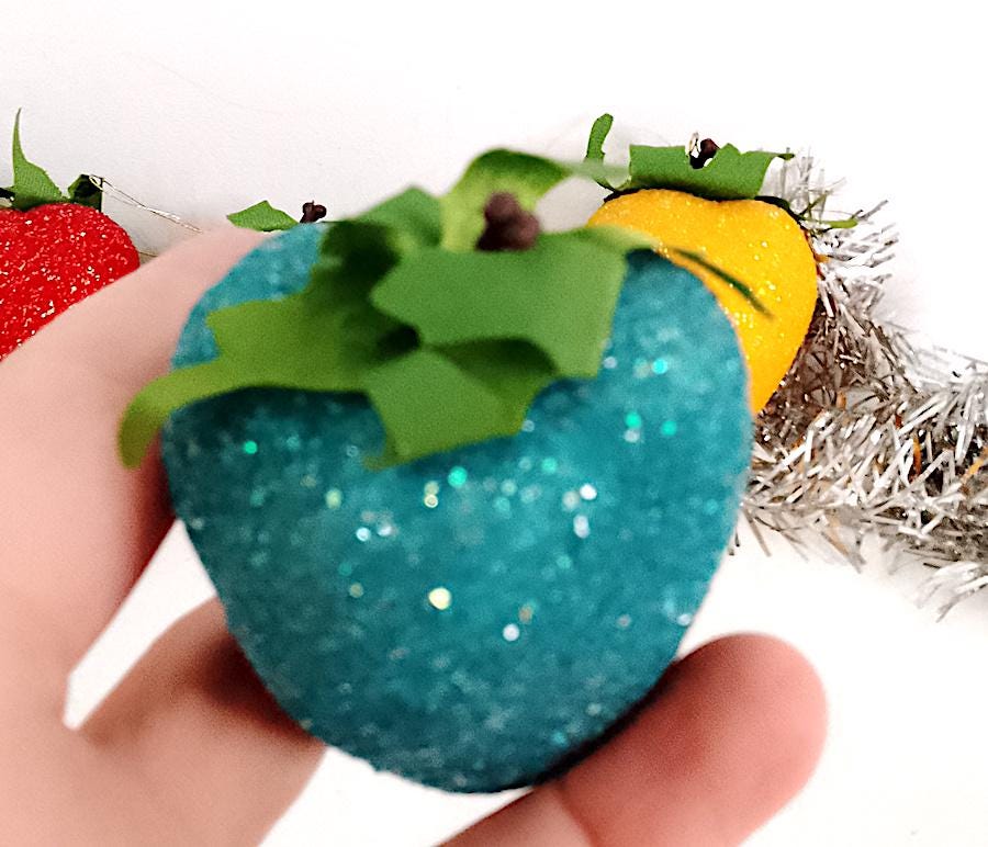 set of 6 strawberry-shaped Christmas decoration balls - multicolor with iridescent glitter - excellent and delicious, only one is missing the hanger - as is