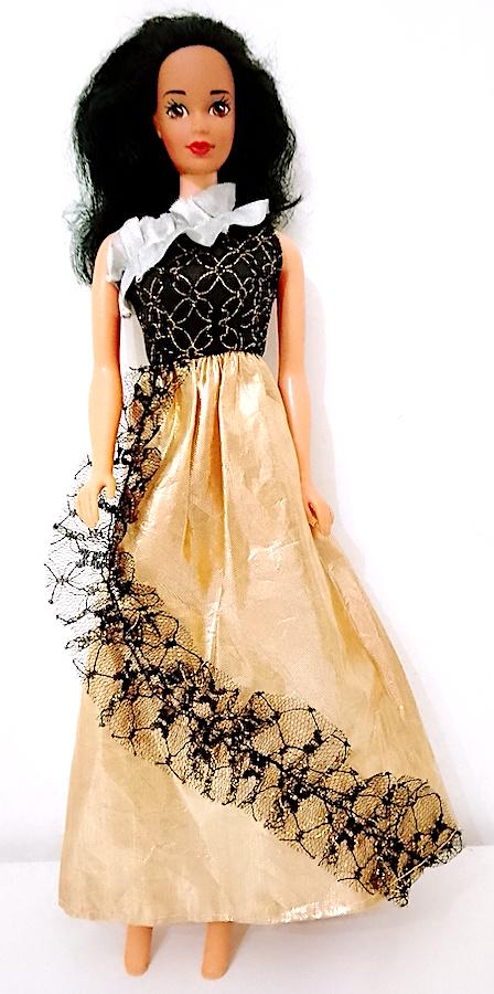 beautiful dress with wide golden skirt and black lace top with silver decoration - original early 80s - it is tight for Barbie, the one in the photo is a clone and she barely wears it, it could fit a skipper but it is long, or an old Sindy or Tanya - excellent condition - doll not included - as is