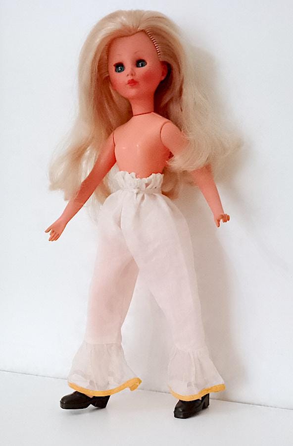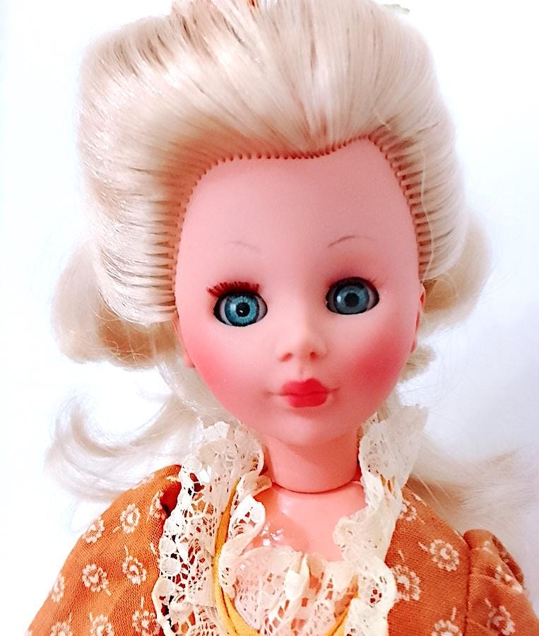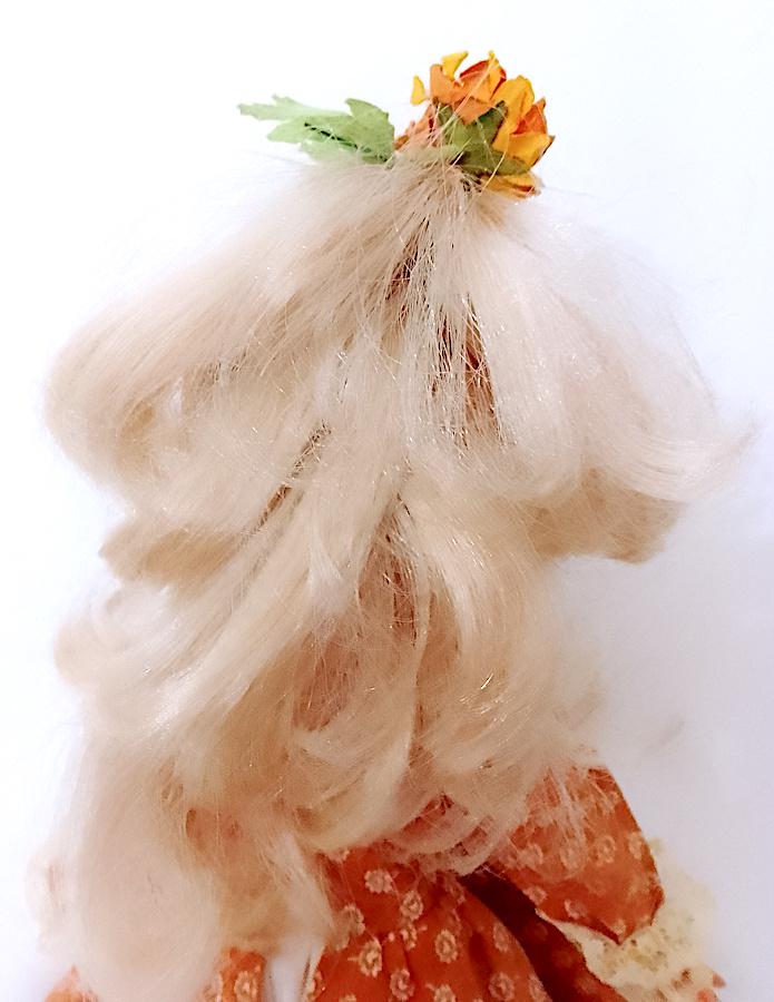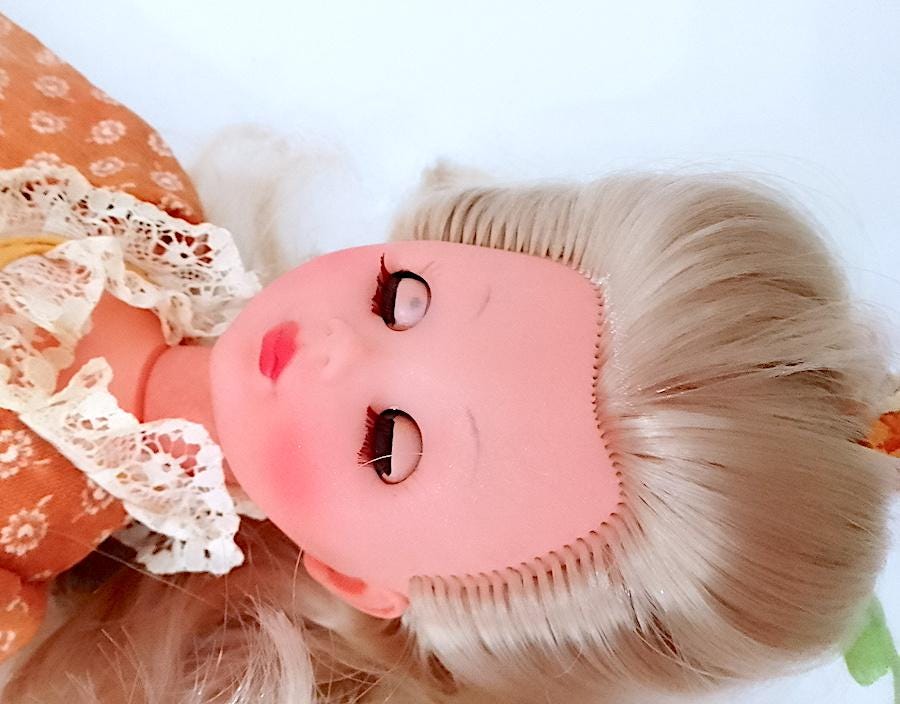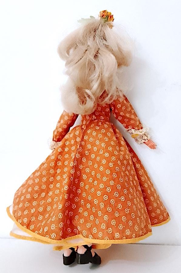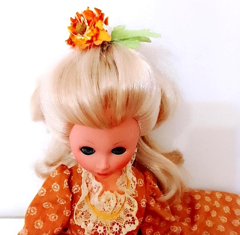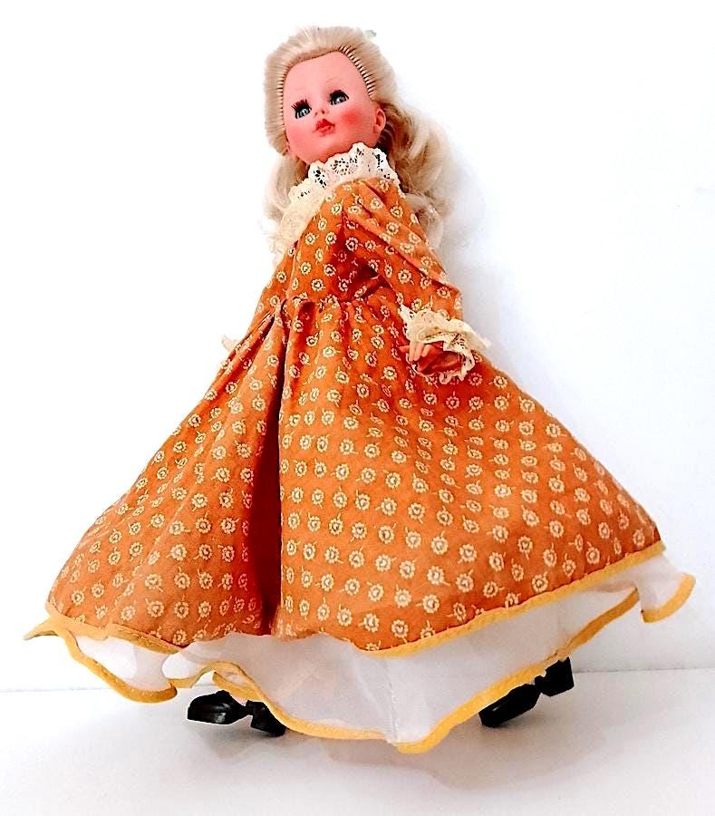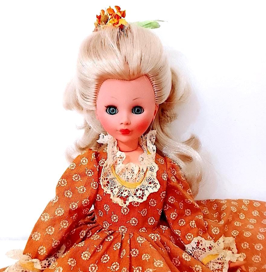 beautiful Corinne doll version 800 from 1978 by Italocremona - gorgeous blond hair washed and combed and sublime face with clicking blue eyes - the body has undergone a restoration because it was cut in half, after welding it holds up very well and the legs do not come off like before - see photo - the dress has been restored and the petticoat has been completely sewn back because it was crumbling - in fact in the underpants you will find some signs and holes in the original edge - umbrella and hat are missing - original flower in the hair - complete with panties, underpants, stockings and shoes in excellent condition - as per photo - as is