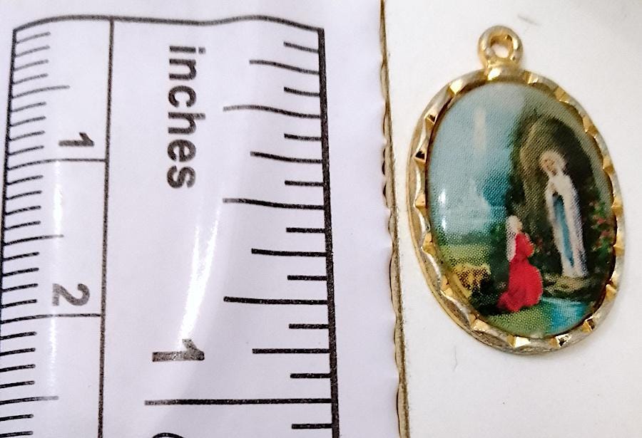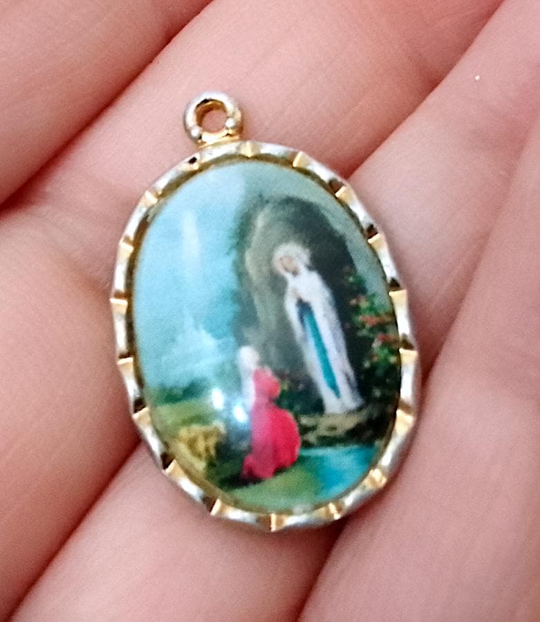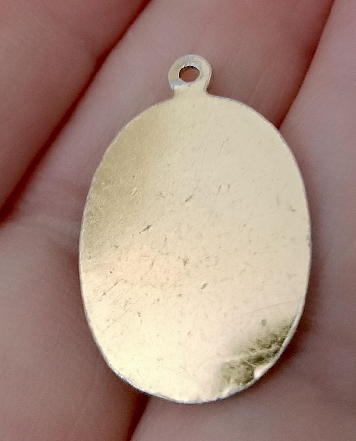 small religious votive medal pendant in gold-plated metal with color image - excellent - as is