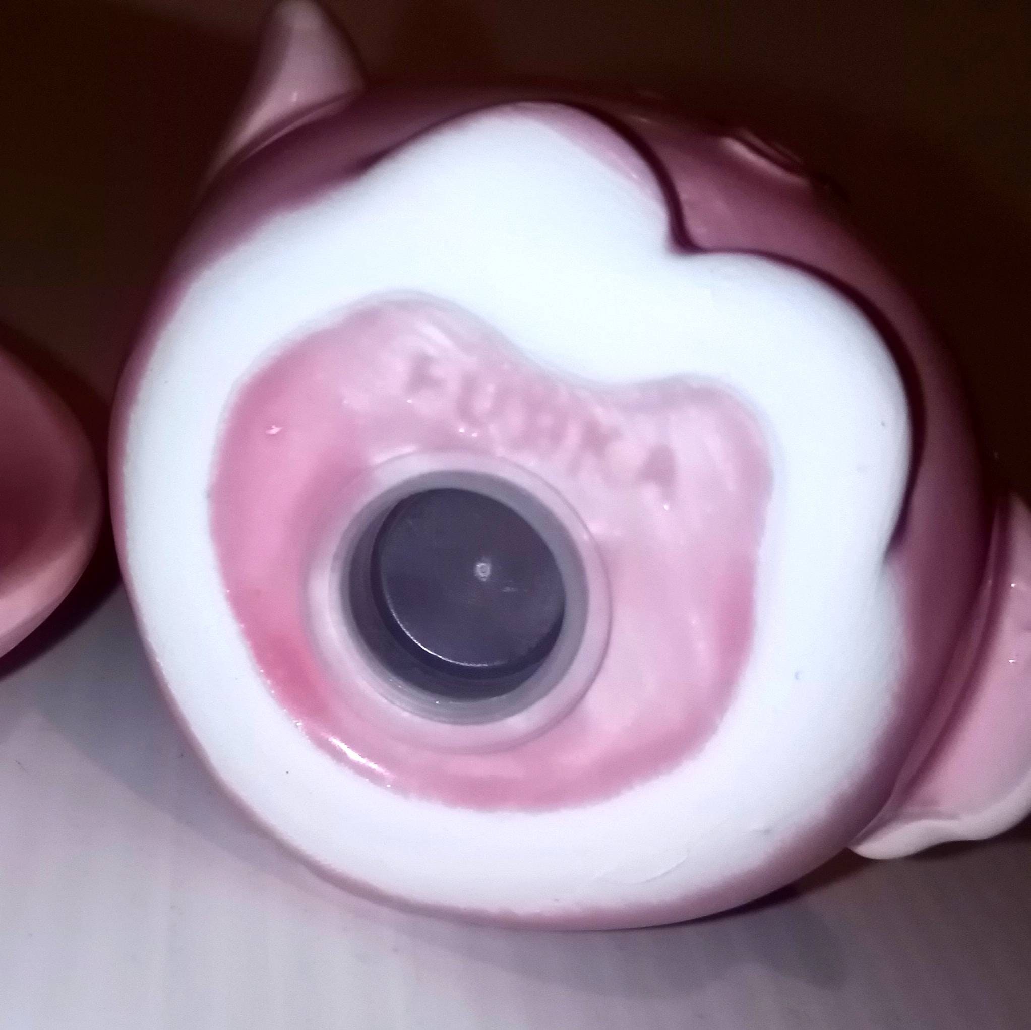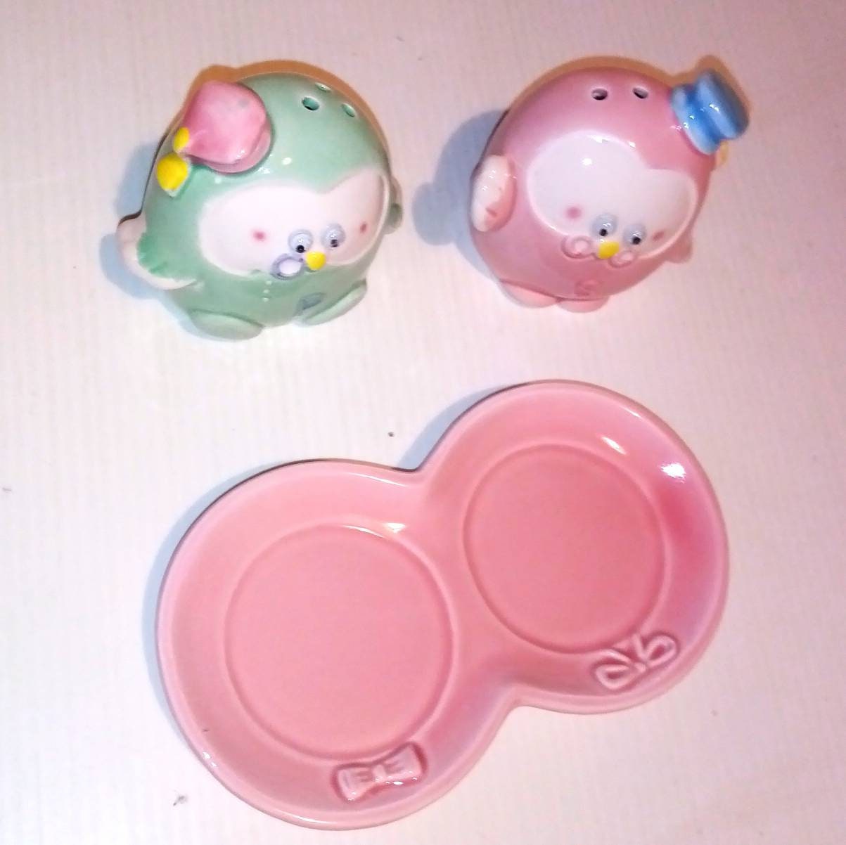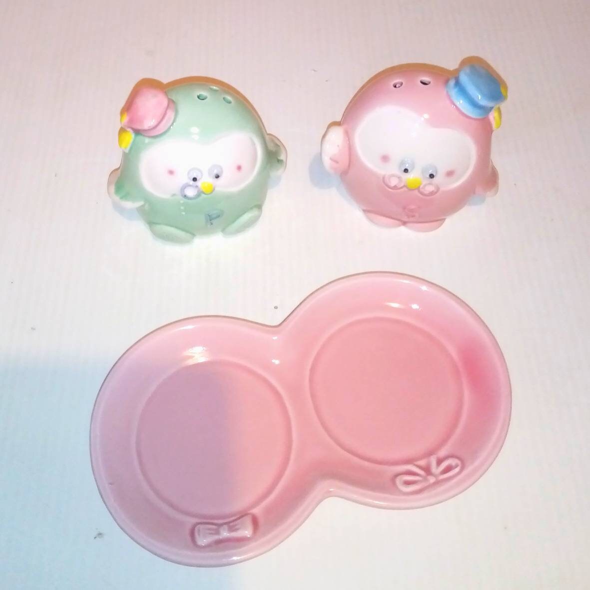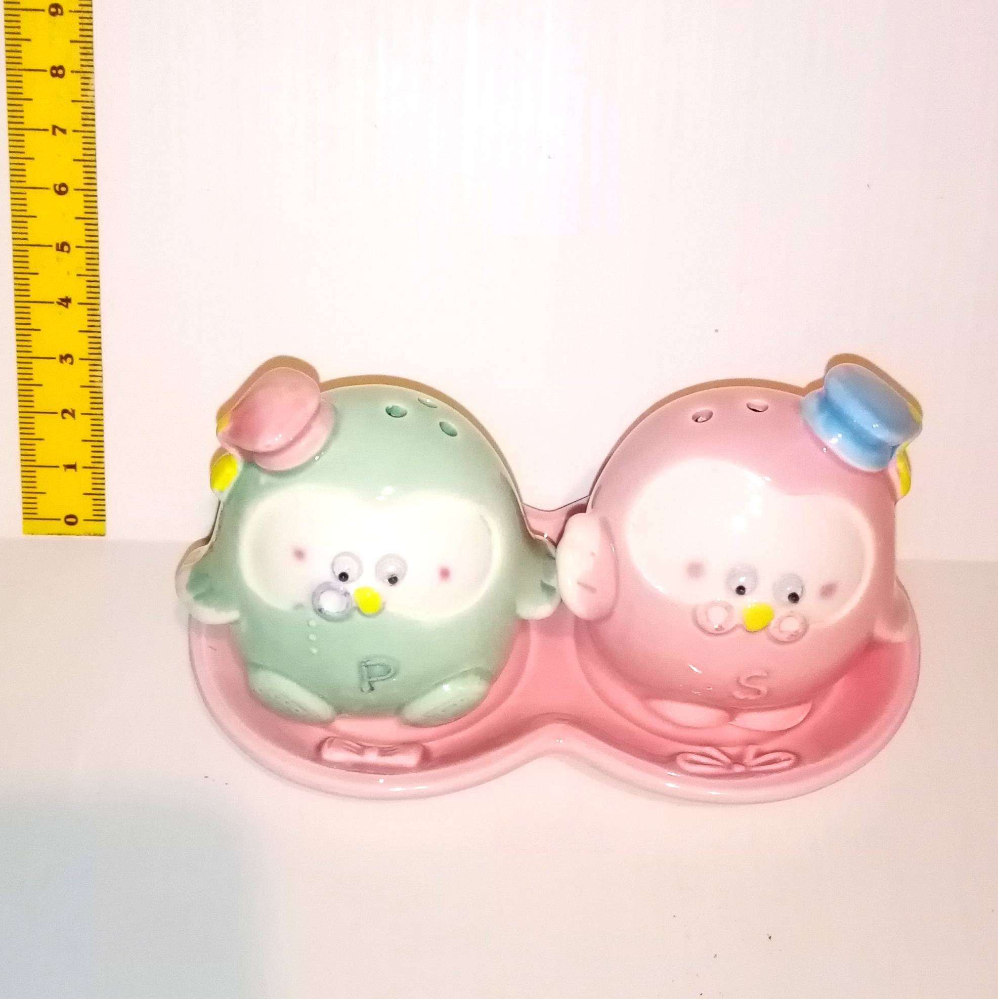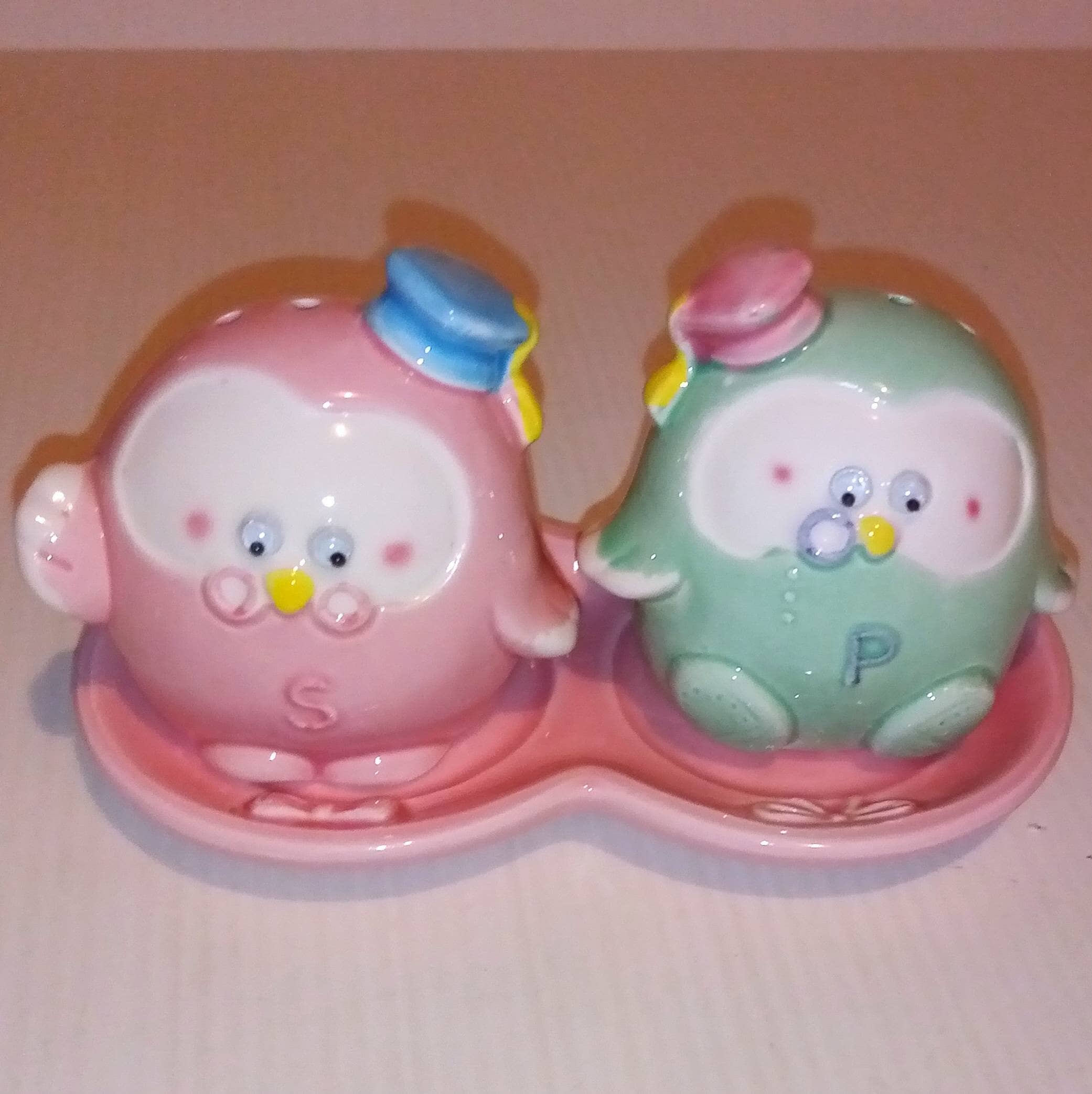 Salt and pepper shaker set with porcelain tray. 80's branded funka japan. Super kawaii. Applied plastic wiggling eyes. Looks like never used. Perfect