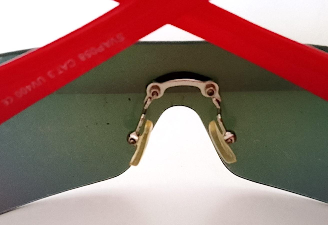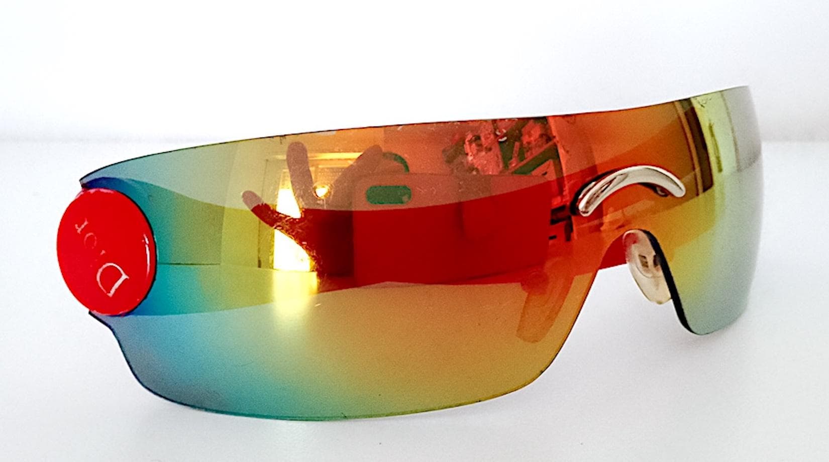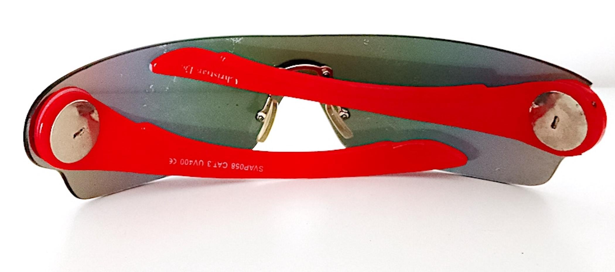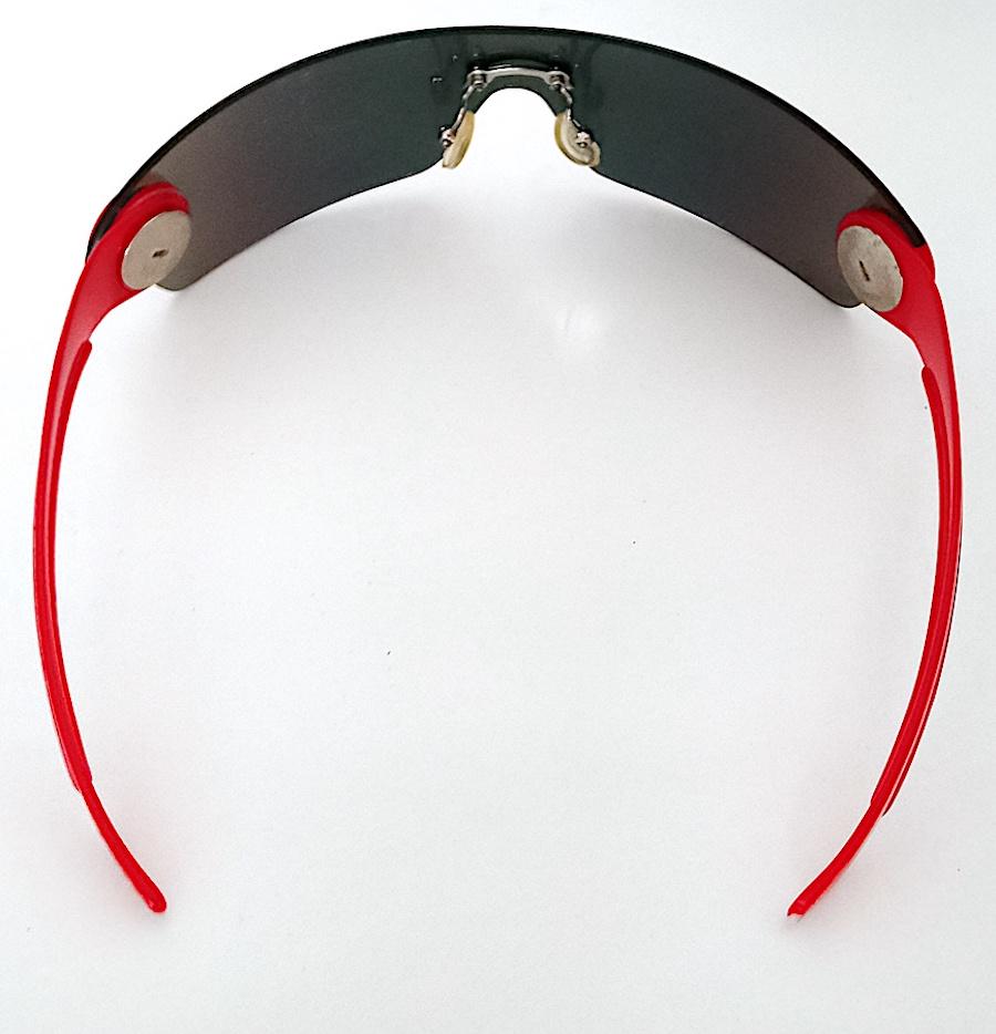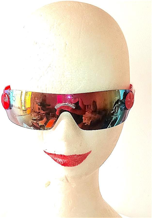 rare folding plastic schlak sunglasses with iridescent mirrored lenses, rotating and adjustable red temples