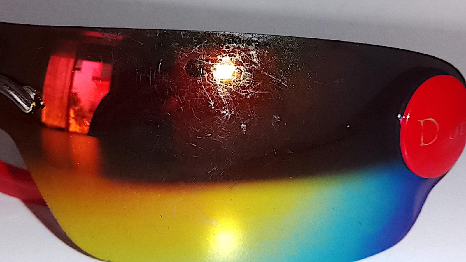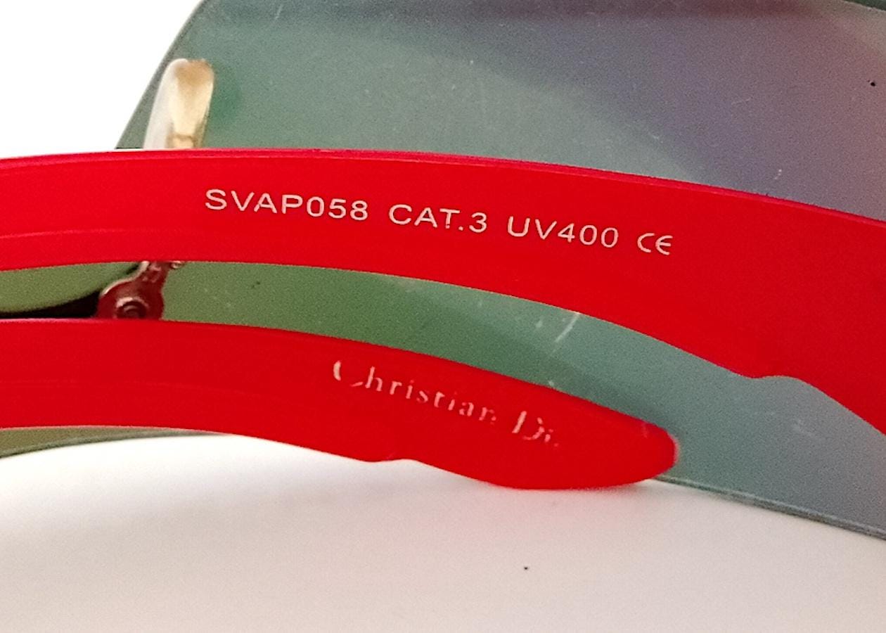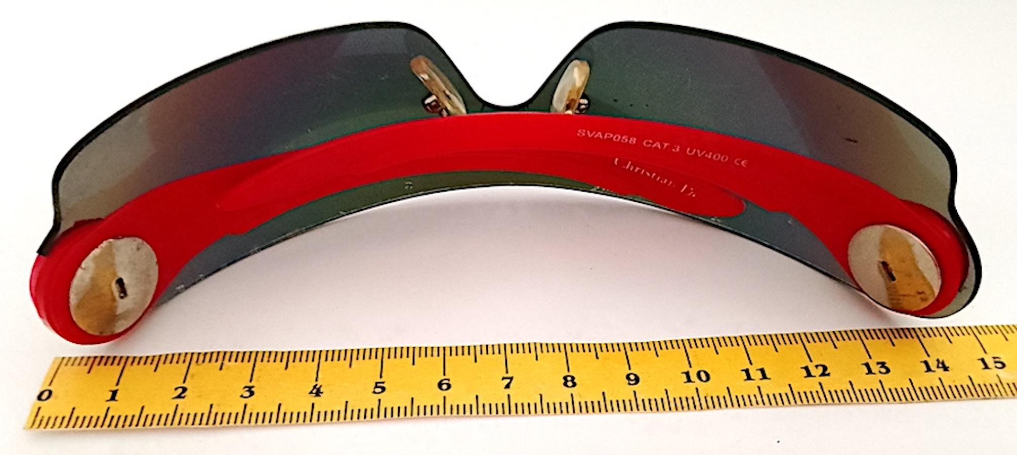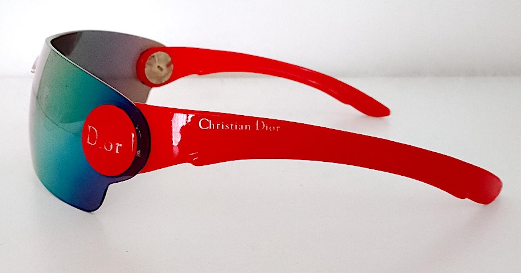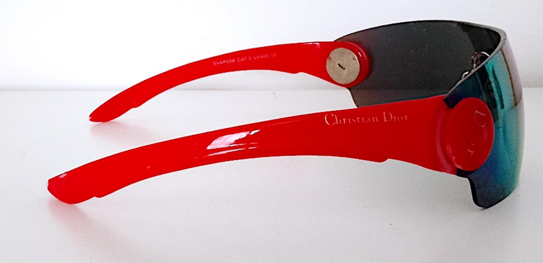 rare folding plastic schlak sunglasses with iridescent mirrored lenses, rotating and adjustable red temples