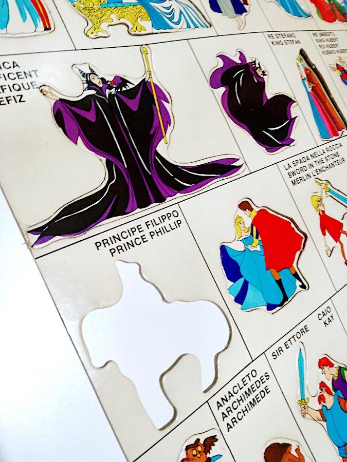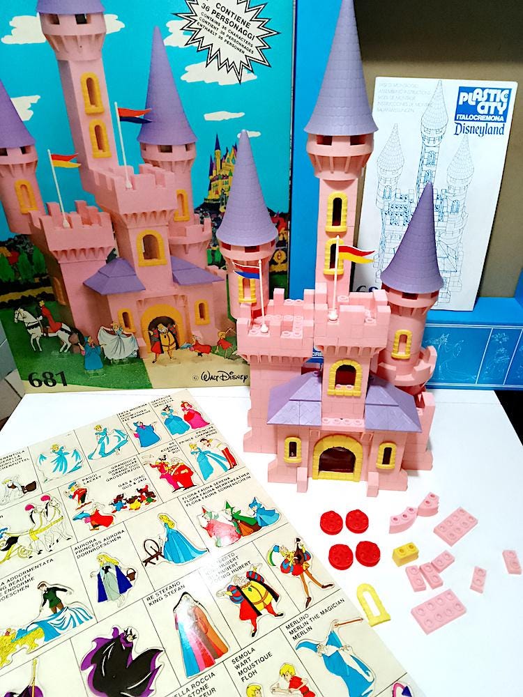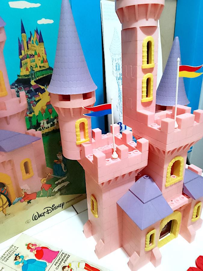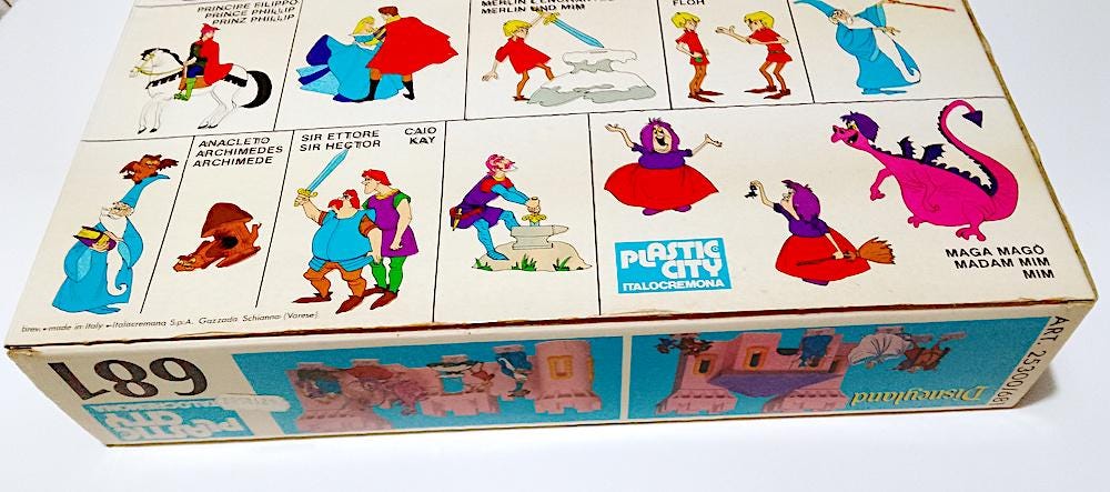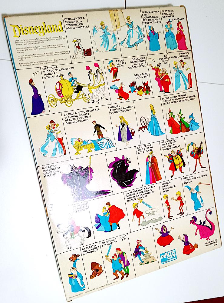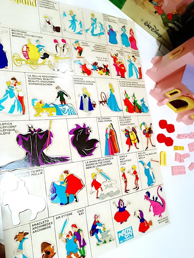 Splendid playset dedicated to Disney fairy tales: Cinderella, Sleeping Beauty, The Sword in the Stone - used, some signs of dust from time but no breakage - excellent box - not complete with all the pieces but since they are not numbered I don't know how many are missing, the biggest problem is completing a large circular tower - the board includes 33 out of 34 characters, Prince Philip is missing - it also includes extra pieces that I add + instructions - the transparent bases for the characters are missing but you can use the small flat pink pieces from 2 buttons left over - among the characters I point out the splendid Maleficent, Cinderella and Aurora in various versions, absolutely splendid and vintage designs - conditions as per photo - as is