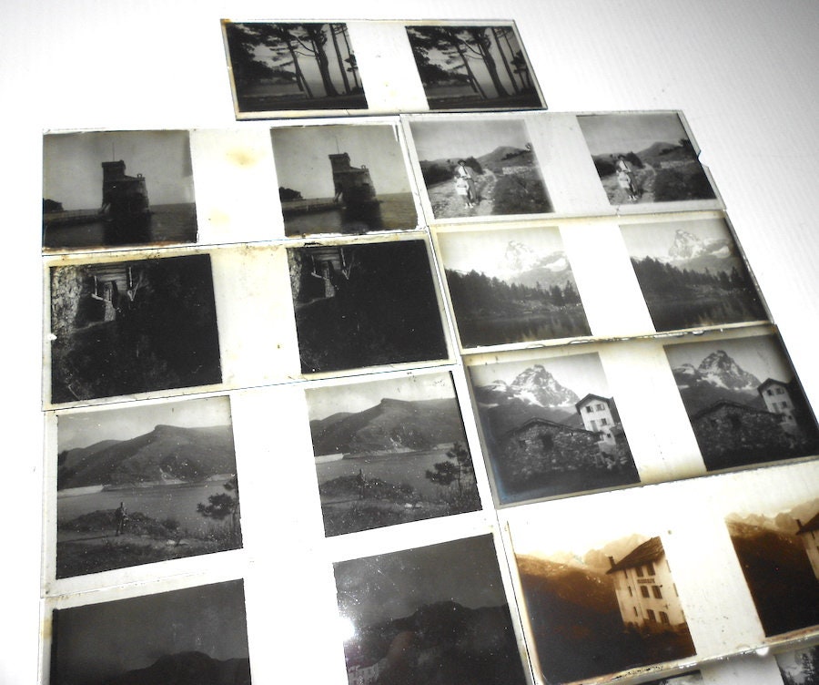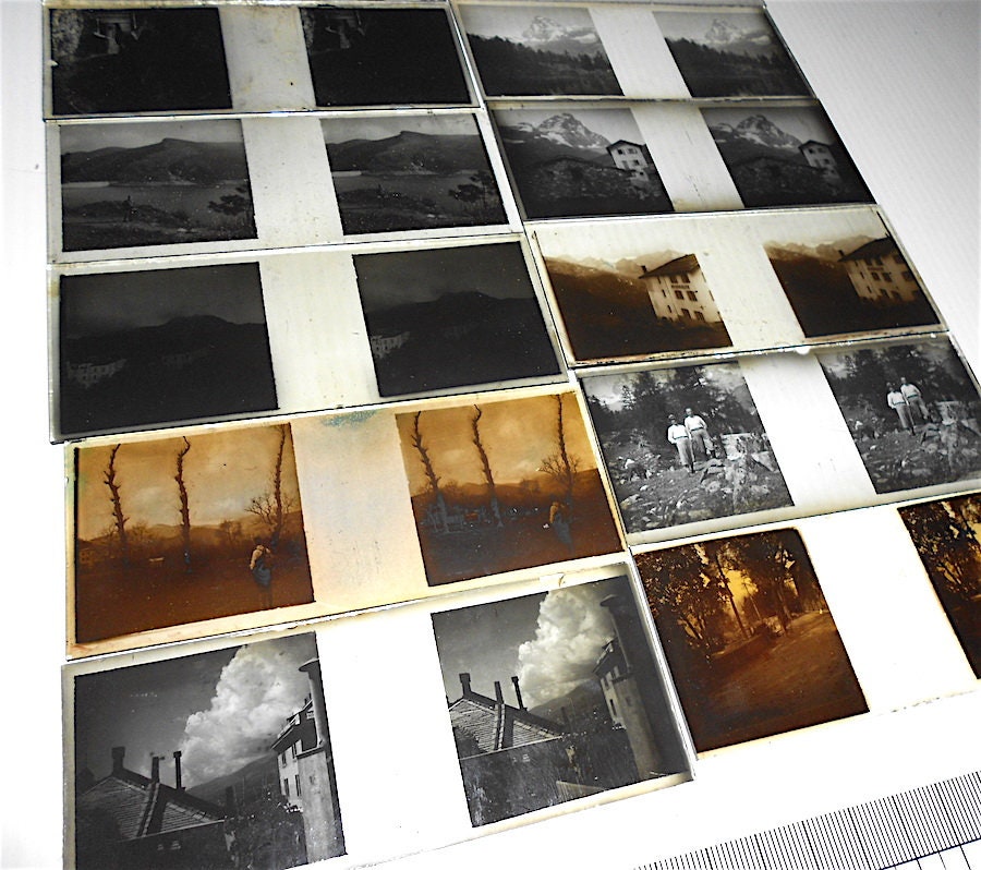 Splendid little box from the early 1900s with 13 plates with silver bromide photographs depicting a trip to the Aosta Valley